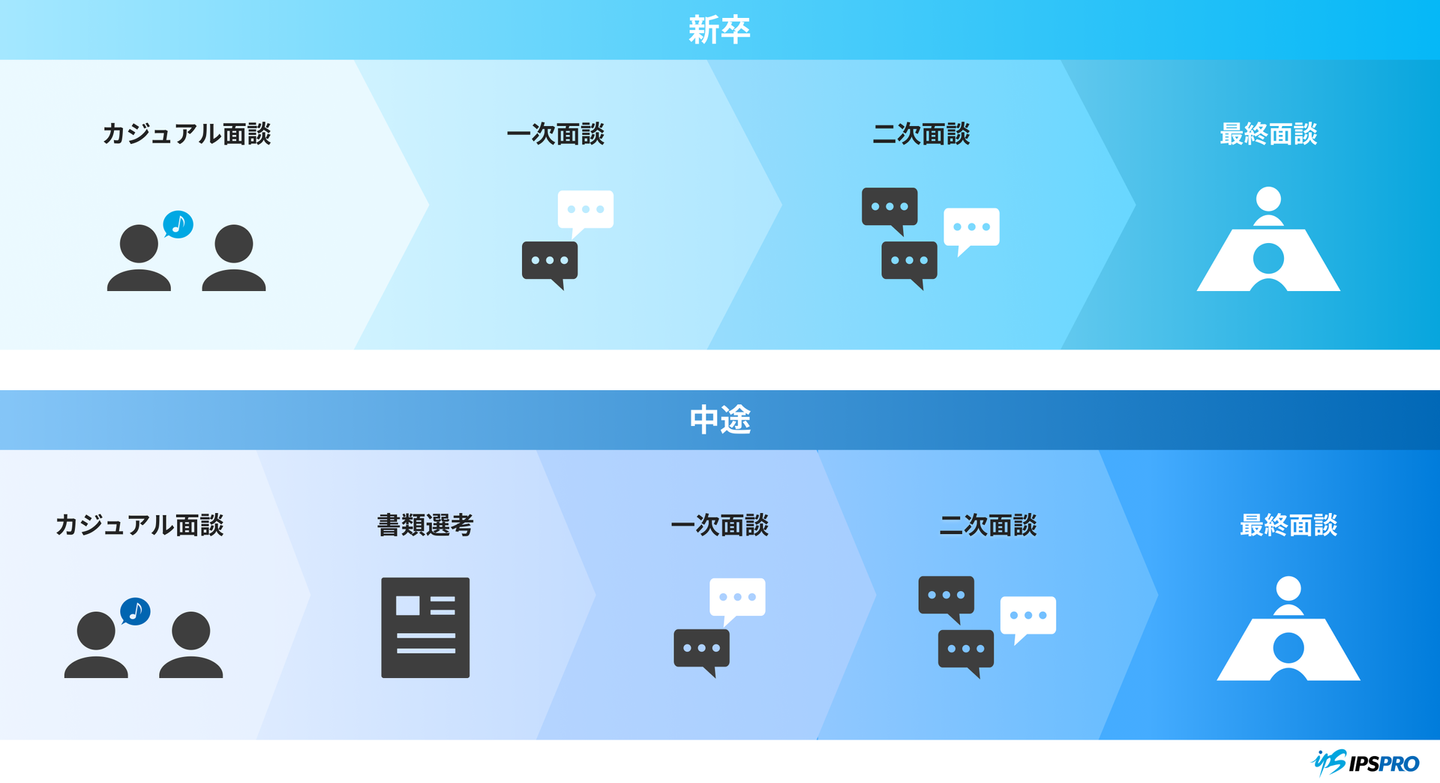 採用フローについては、新卒と中途の方で多少異なりますので下記フロー図をご参考ください。