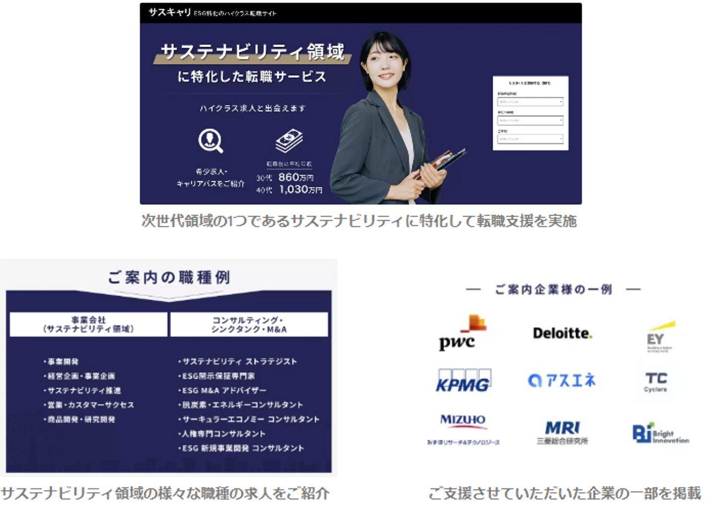 クライアントはサステナビリティ課題(脱炭素・資源循環・生物多様性・人権ダイバーシティ等)を解決するような事業会社やコンサルティングファーム・金融機関等のサステナビリティ職種に特化しています。