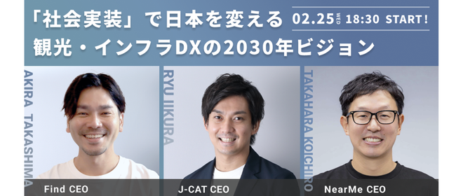 【交流イベント】"社会実装"で日本を変える。観光・インフラDXの2030年ビジョン──シリーズB・Cの起業家 J-CAT × find × NearMe が明かす、巨大な負を解く事業成長の裏側J-CAT 飯倉 × find 高島 氏 × NearMe 高原 氏。2030年の日本をアップデートする起業家3名が、巨大な負を解く「経営戦略」と「事業成長のリアル」を語り尽くす、パネルディスカッション含めた交流イベントです。3社の取り組みに興味がある方、採用や協業に興味がある方どなたでも参加可能です。イベントの終盤ではお酒・食事を交えた交流会もあり、今話題のスタートアップ経営者と是非お話してみま...