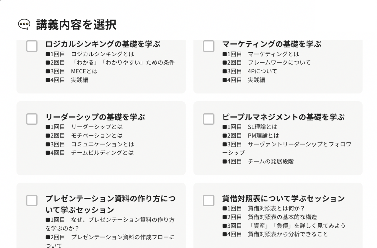 マーケティング、コーチングに以前から興味があったので、4回コースを受講したメンバーや、ピープルマネジメントの基礎や人的資本経営について学ぶセッションも人気です。1対1でカウンセラーと話せるため、ただ受講するのではなく、学んだことをインプットし、実際に自身の意見や行動をアウトプットする場として活用しているメンバーもいます。