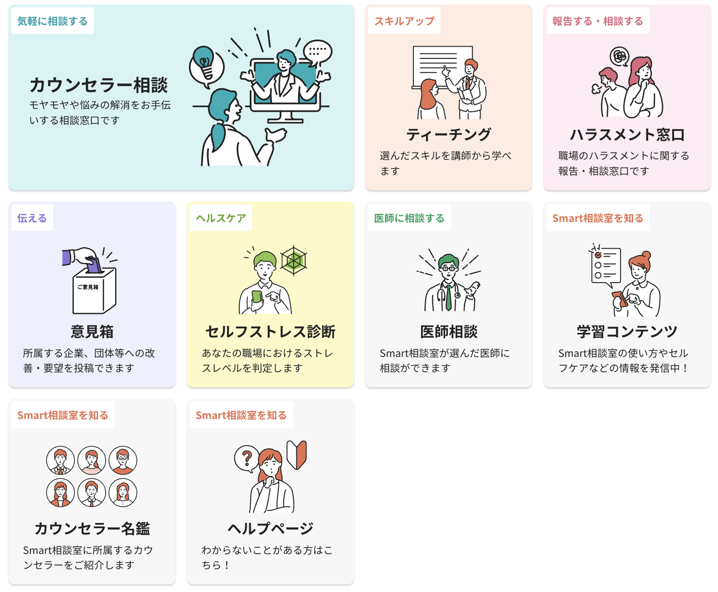 社員の感想:プライベートや仕事について普段気軽に相談できる人は意外と少なく、1人でモヤモヤする時間が続くことがありました。Smart相談室の方に、限られた時間の中で自分の悩みを聞いていただき、気持ちを整理することができ、相談の後はすっきりした気持ちになりました。きっとまた新しい悩みが湧いてくると思いますが、その時もSmart相談室の方に気軽に話を聞いてもらおうと思います。