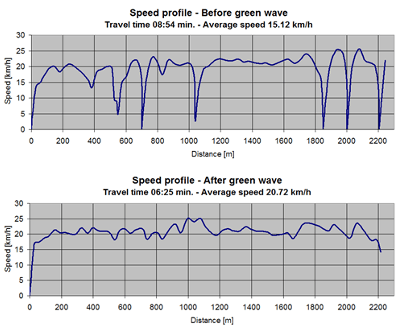 グリーン・ウェーブの導入により、自転車の平均速度は15.1km/hから20.7km/hに向上し、自転車の速度の安定化が確認されている他、通勤や通学時間が約2割短縮されることが示されています。