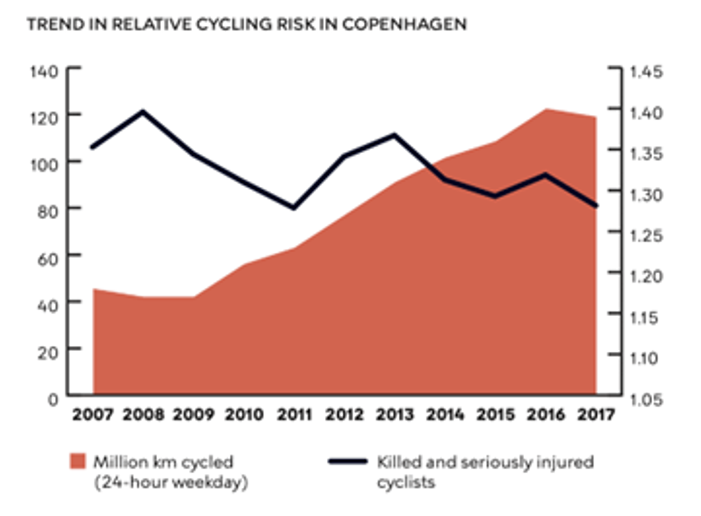 更に、グリーン・ウェーブや自転車道の広大化、自転車に関する教育の広がりに伴い、自転車の利用者数と反比例して、事故数や怪我などのリスクは減少しつつあり、ヨーロッパの中でも最も自転車事故による死亡率が低い都市になっています。