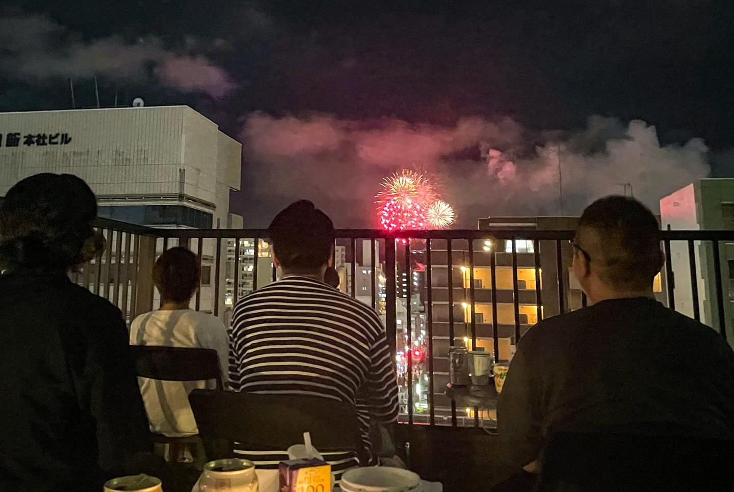 エンスペースでは年間を通して様々なイベントが催されており、仙台七夕祭の前夜祭には、屋上に食べ物や飲み物が用意され、ビルに邪魔されることも人混みを気にすることもなく、ゆっくりと花火が見られます。