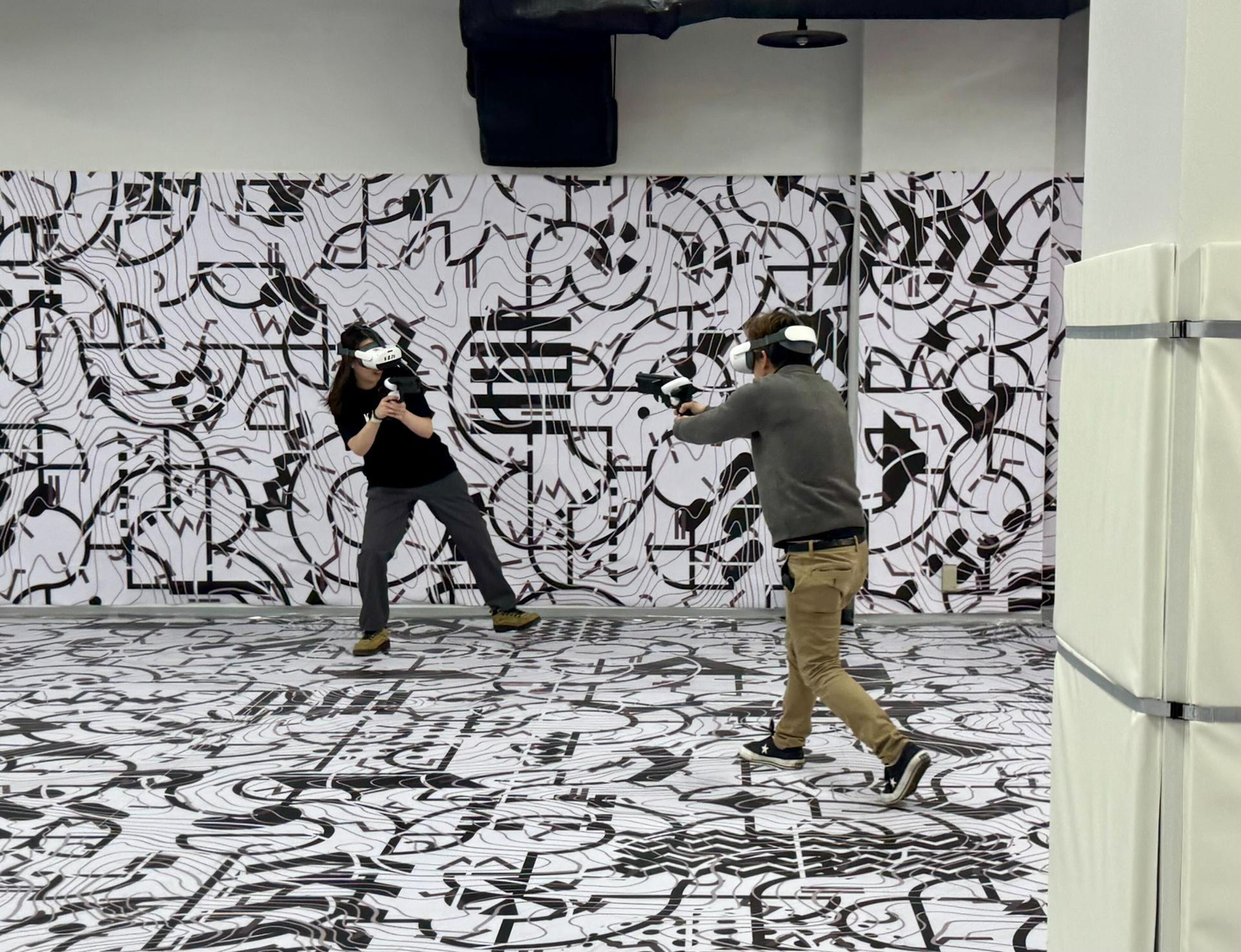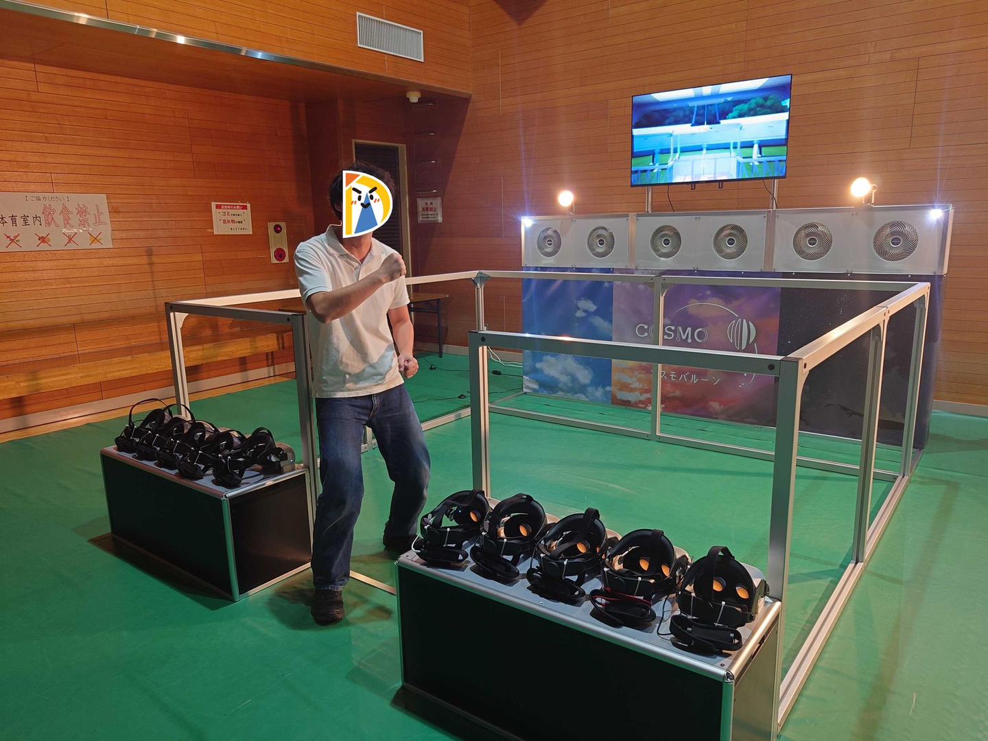 これは空間を自由に動き回れる、いわゆるフリーローム型のVRサバゲー、『Infinity Wars』を設置したあと、動作確認しているところです!