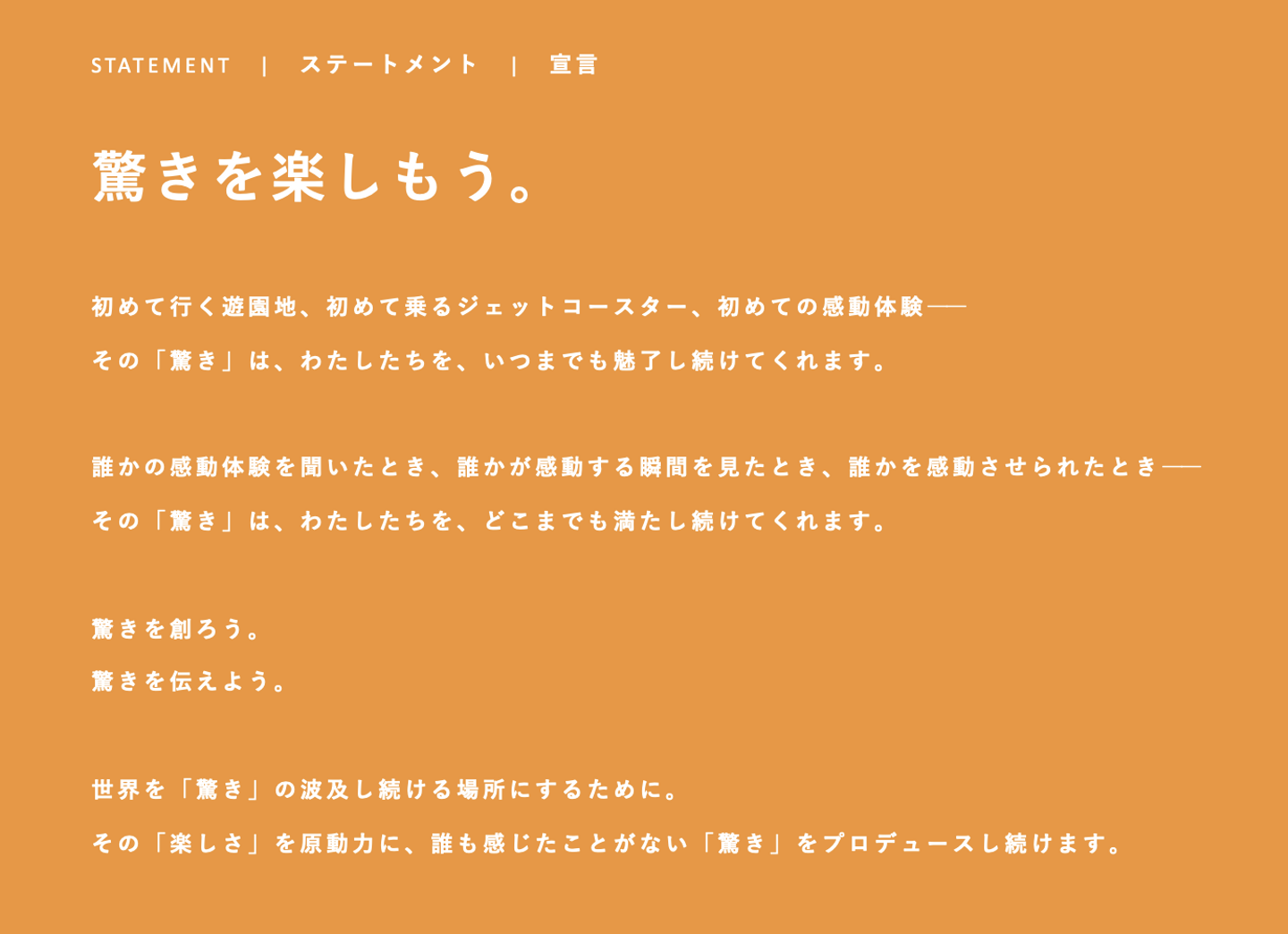 それを表すステートメントになっていて、「すげー!」とか「楽しー!」とか、そういう“人の感情”を揺さぶるモノを作り、それを各地へと広げていくという想いを込めています。