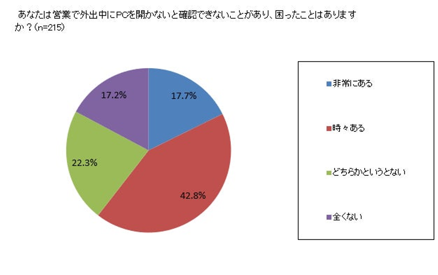 また、60%が顧客や商談管理の入力などの事務作業に時間をとられることにより「通常業務(営業活動)に支障がでている」とのことでした。営業で外出中にPCを開かないと確認できないことがあり困った経験ありが、60.5%にも上りました。