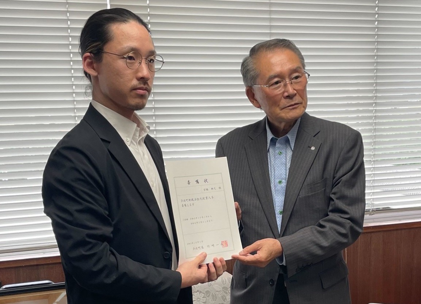 4日に委嘱状交付式が執り行われ、芦北町の竹﨑町長からLiNew社員である宮脇典之へ委嘱状が交付されました。