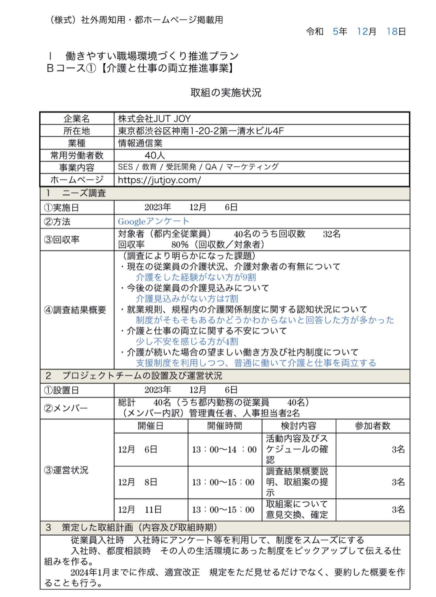 - 人の「市場価値」を高め、人生の選択肢を増やす会社です。 JUTJOYは、 未経験からでもITスキルを身につけ、市場価値を高めていける環境をつくっている会社です。 エンジニア・Webデザイナー・QAエンジニアなど、 ITを軸にしたキャリアを、一人ひとりのペースで築けるよう支援しています。 私たちが提供しているのは「仕事」だけではありません。 スキルを通じて、自分の人生を自分で選べる状態になること。 人の成長と挑戦を支え続けることが、私たちの使命です。 ▍Webデザイナー/エンジニア/QAテスターなどを育成する事業 ...未経験からIT業界に挑戦したい方に向けて、 実務を見据えたカリキュラムと伴走型サポートで人を育てる事業です。 エンジニア・Webデザイナーとしてデビューしたメンバーも多数います。 「学んで終わり」ではなく、現場で活かせる力を身につけることを大切にしています。 ▍System Engineering Service(SES)事業 …大手企業や成長中のベンチャー企業の開発・テスト・運用案件へエンジニアをアサインし、 Webサービスやエンタメ、通信、公共分野など幅広い業界の現場で課題解決を担っています。 案件内容や単価を開示し、成長に応じた透明性の高い評価制度を整えています。 エンジニア本人の希望や成長段階をすり合わせながら、案件選択やキャリア形成を一緒に考えています。 ▍Web制作・運用領域 ...これまでに、WebサイトやLP、名刺制作・運用に携わってきた実績があります。 関連企業と連携し、デザイン・システム・マーケティングを横断したプロジェクトも経験してきました。 こうした知見を活かし、開発やQAの現場でも「使われる視点」を大切にしています。