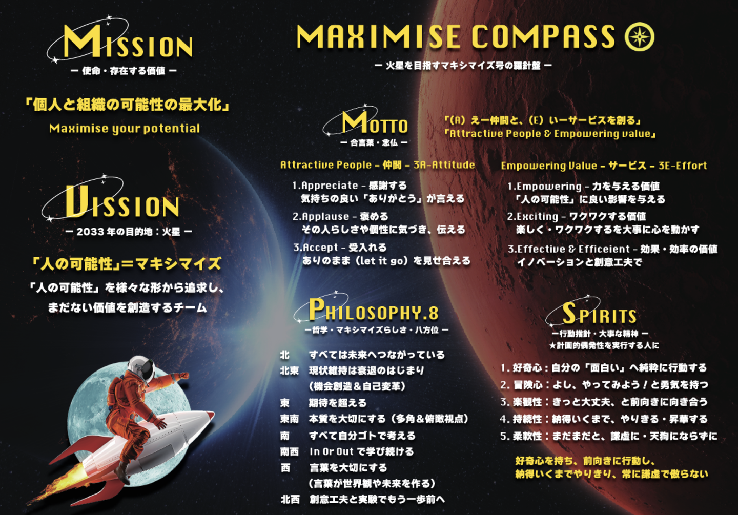 誰も、そしてどの事業社もまだこの「人の可能性」という分野には到達していない場所です。そこをマキシマイズは目指しており、未踏の地ということで「火星」と言っております(笑)。ちょっとふざけて聞こえますかね。。しかしマキシマイズは「何事も楽しむ」「真面目なことも面白く」という文化があるので「火星」で社員全員が共通認識を持っています。