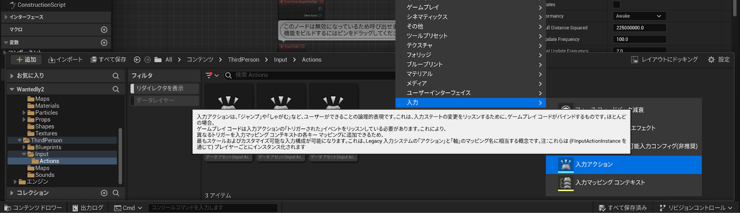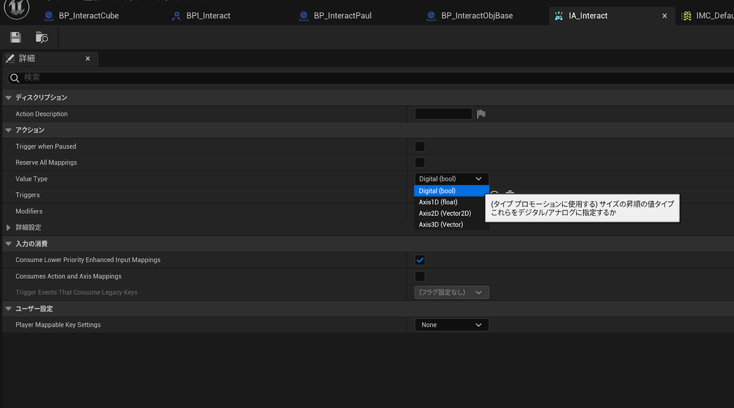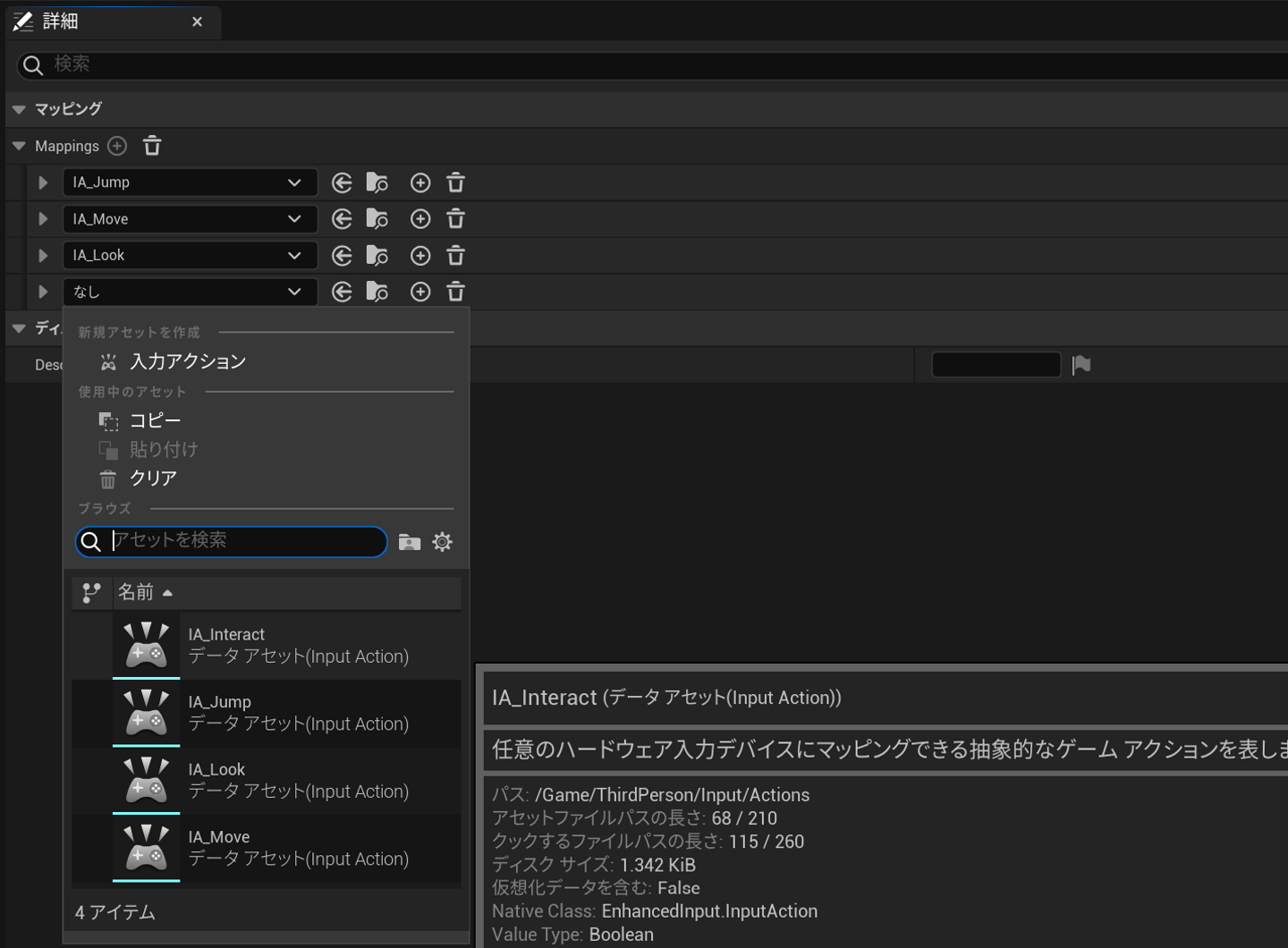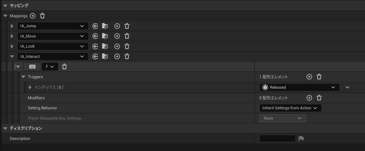 UE5からこのインプットアクションの設定が推奨されており、ゲームを作る上で必須な設定項目となるため覚えておきましょう!