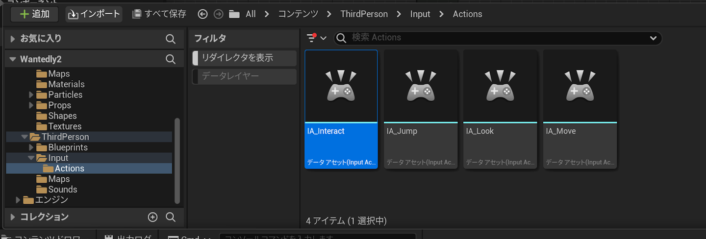 ではまず、コンテンツ/ThirdPerson/Input/Actionsファイルの中にデフォルトのインプットアクションファイルがあるので、それを追加していく必要があります。