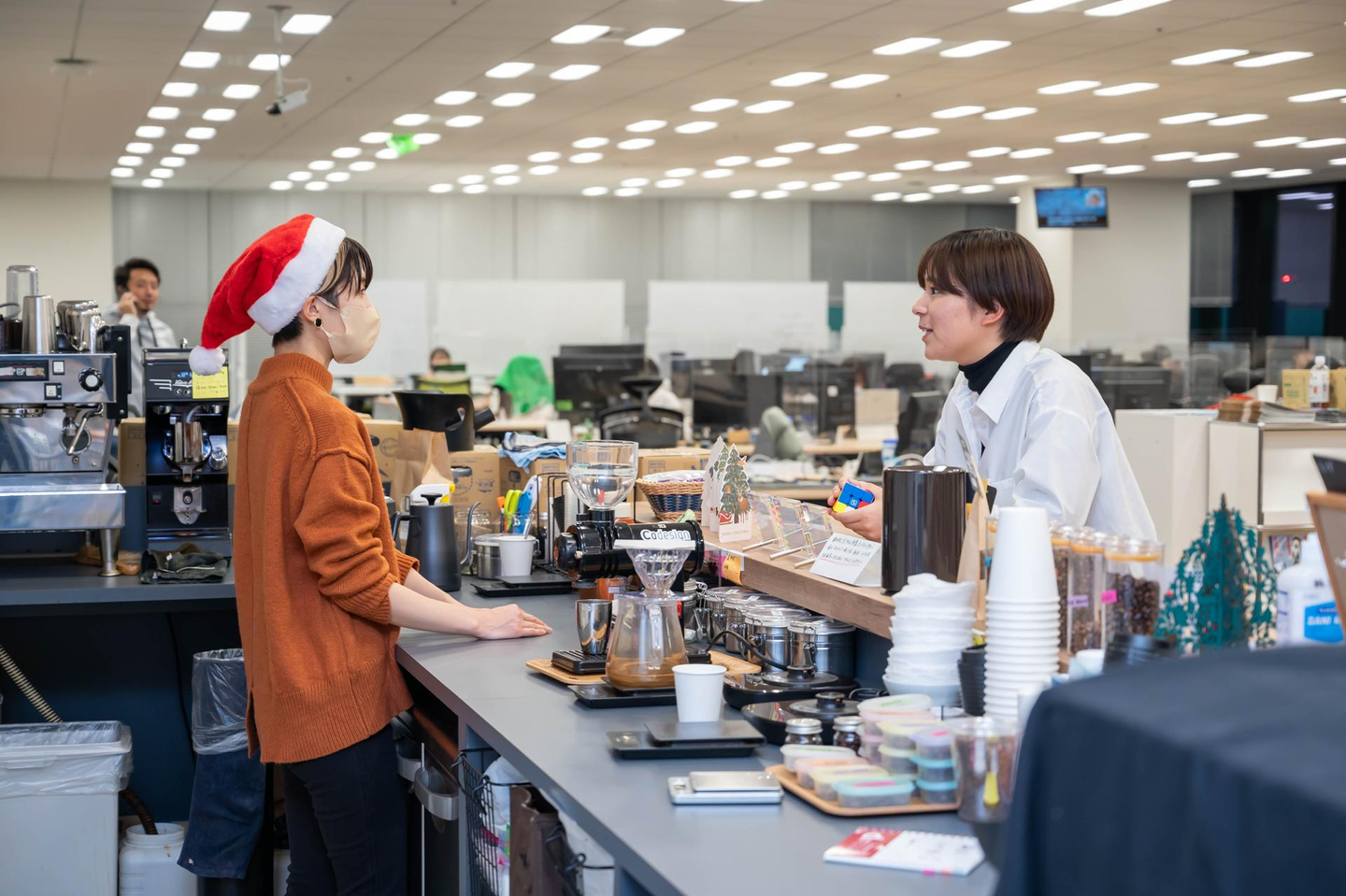 サイバーエージェントグループ共通の社内カフェ「論Ⅱ」。季節ごとに変わる限定ドリンクや軽食が社員価格で安く美味しく頂ける大人気のカフェです。バリスタさんと社員はとっても仲良し!