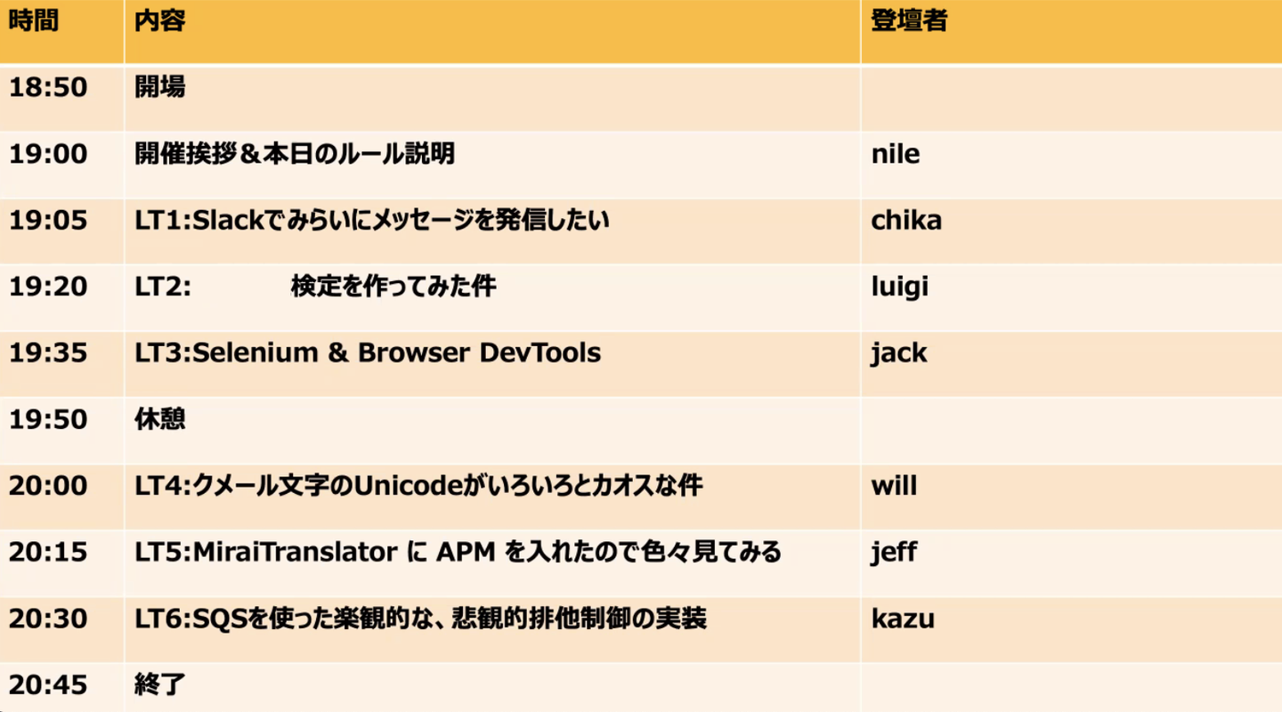 私個人、自分が興味を持っている技術に関してアウトプットがするのが好きなので、LT大会という場ができてとても嬉しいです!Seleniumを使った色々なブラウザのDevツールに関してや、クメール文字のことは全然知らない話だったので、新しい知識も得られていい会になったな、と感じています。