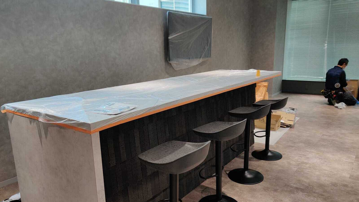 リラックススペースの奥には、バーカウンターを設置。カウンターの側面には木炭のような黒いタイルがびっしり貼られていきます。ちなみにカウンター裏には業務用冷蔵庫が入ります。お酒やおつまみを好きなだけ冷やしまくれます。