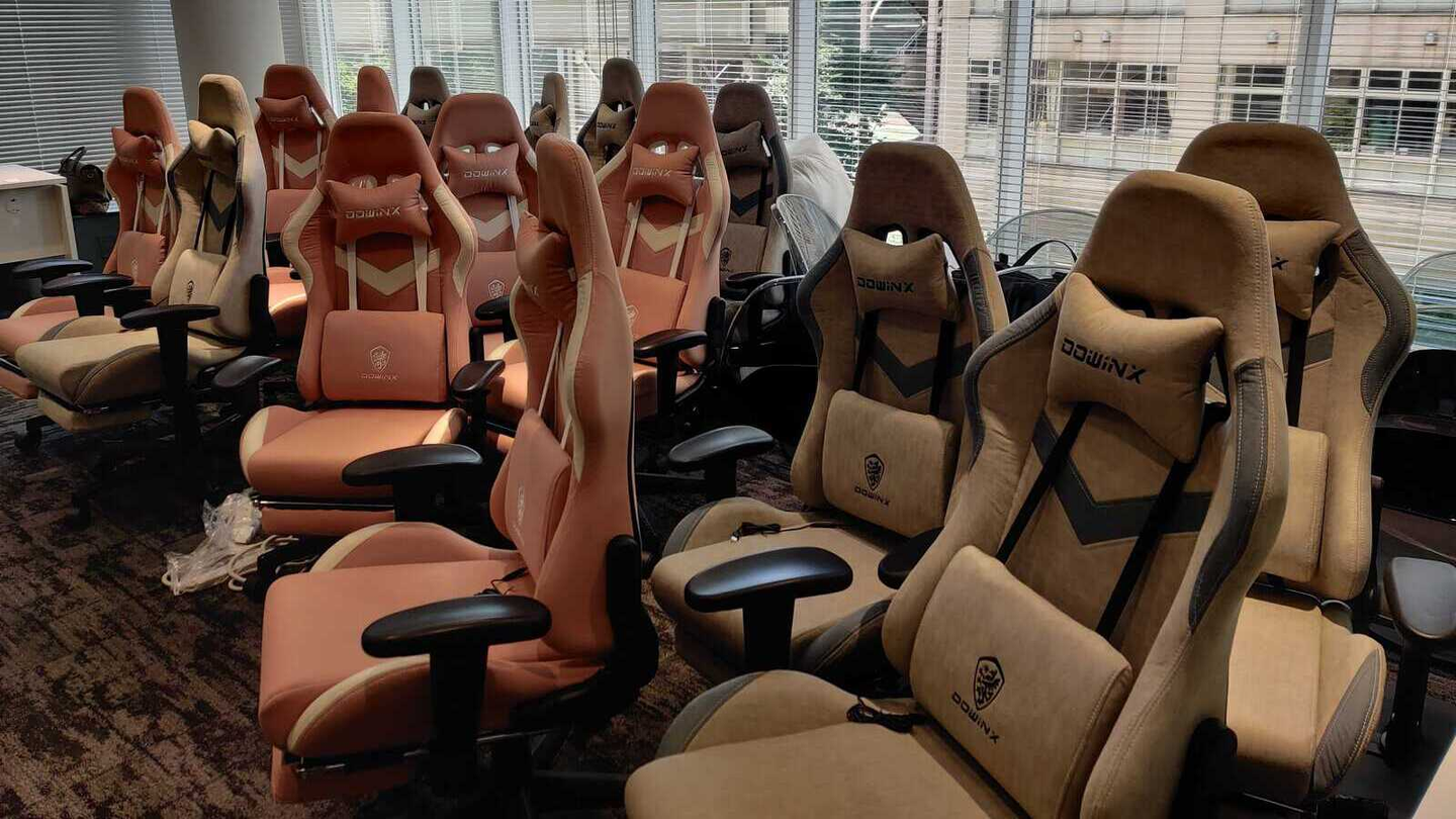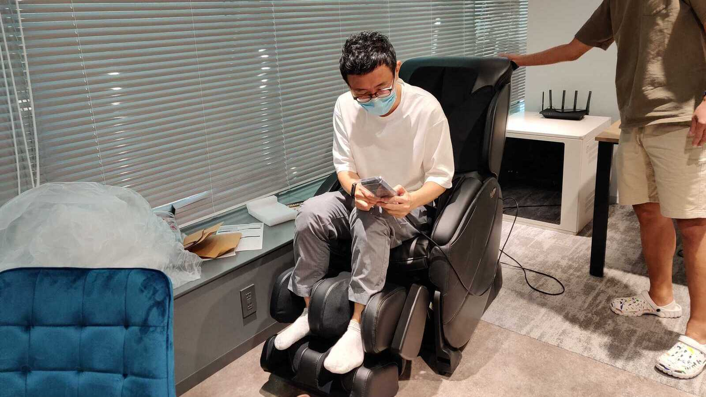 新オフィスでは、すべてのスタッフがゲーミングチェアを使用します。リクライニングでほぼフラットな状態まで寝かせられ、座面下に収納されているオットマンも使えるので昼寝にも最適です。