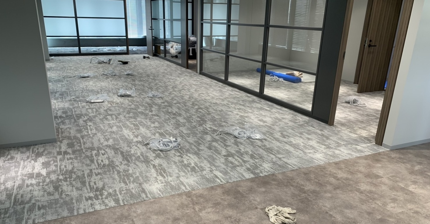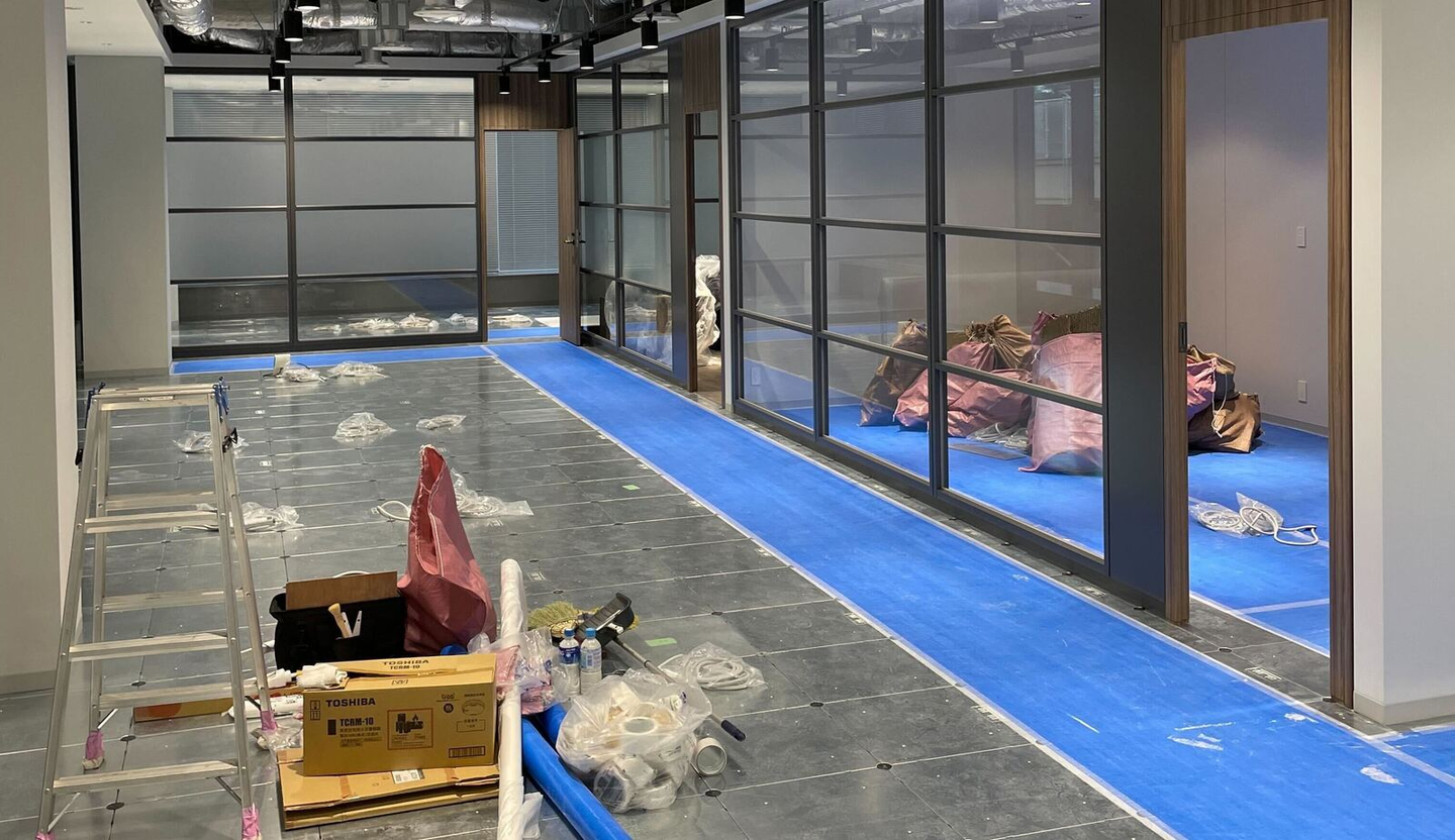 続いてC工事です。まずは床。上記写真では、奥側のグレーの床(カーペット素材)は執務スペース、手前側のブラウンの床(樹脂素材)はリラックススペースとなっています。