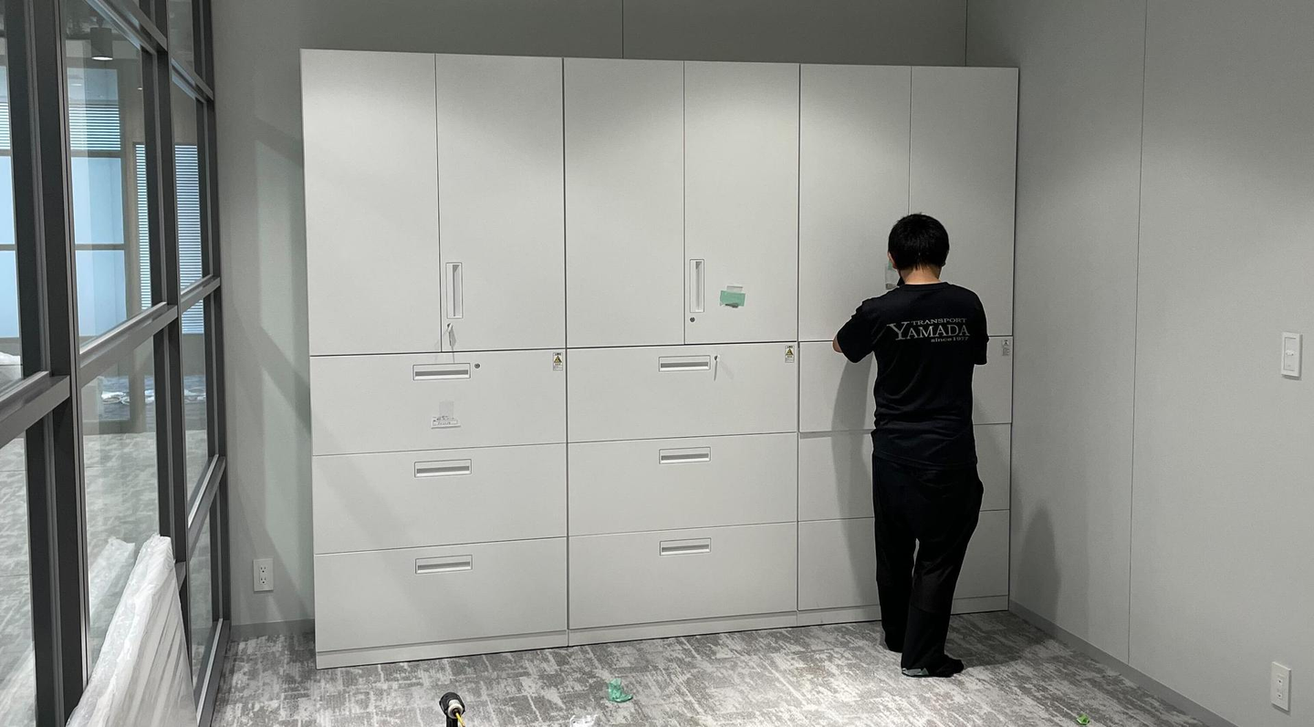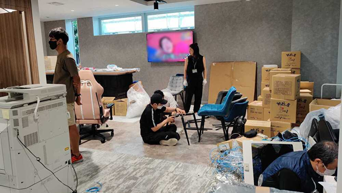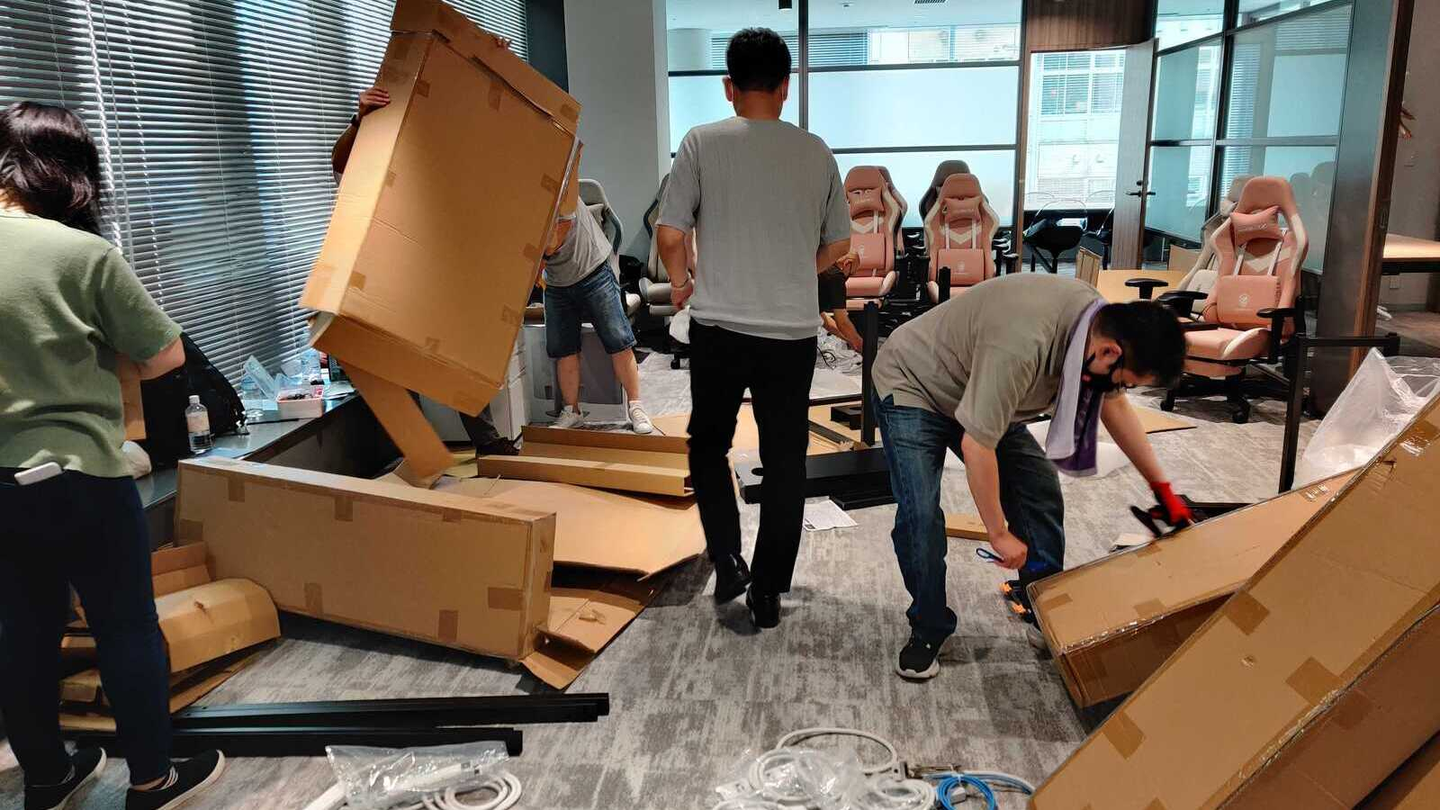 今回はデスクも広いものに新調するため組み立てから行います。スタッフ総出で作業を進めていきます。