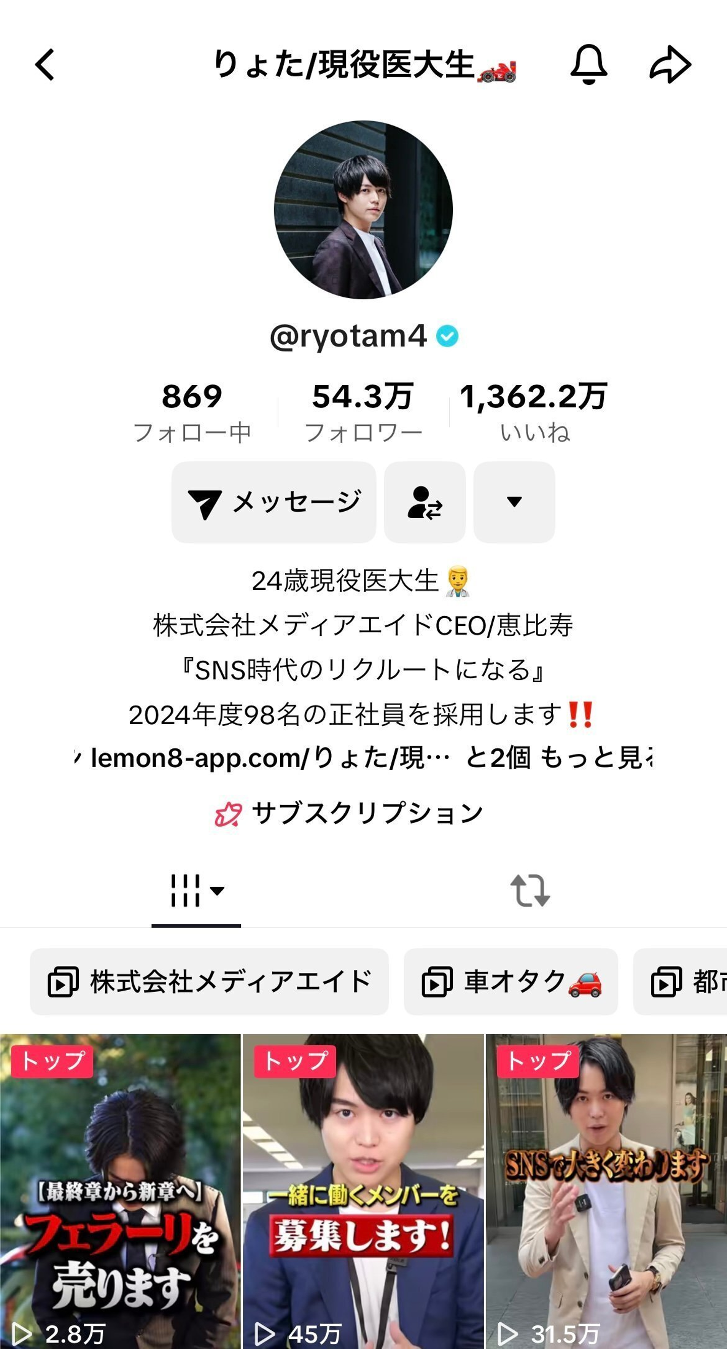 過去には「フェラーリ×医大生×社長」というブランディングを確立し、TikTokで発信を続けました。派手な演出もあり、フォロワーは急増。50万人を超えるまでに成長しました。
