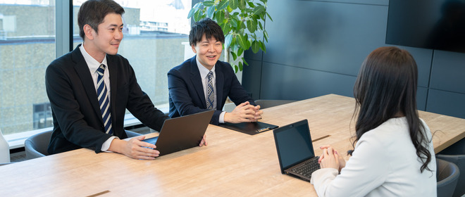 ルート営業では、入社から3ヶ月で独り立ちを目指せるよう、座学やロールプレイング、先輩社員との同行を組み合わせた研修を実施。