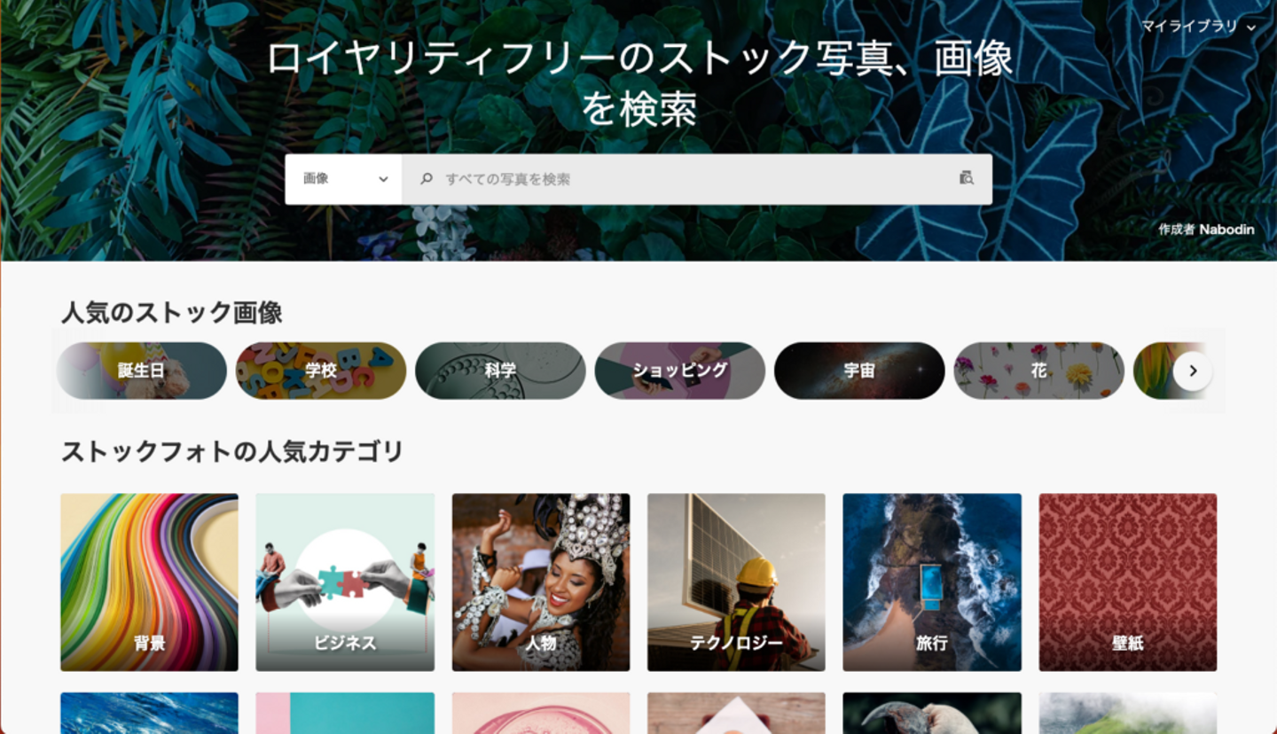 写真やイラスト、3Dや映像など様々な素材があり、一部無料で使える素材も用意されています。
