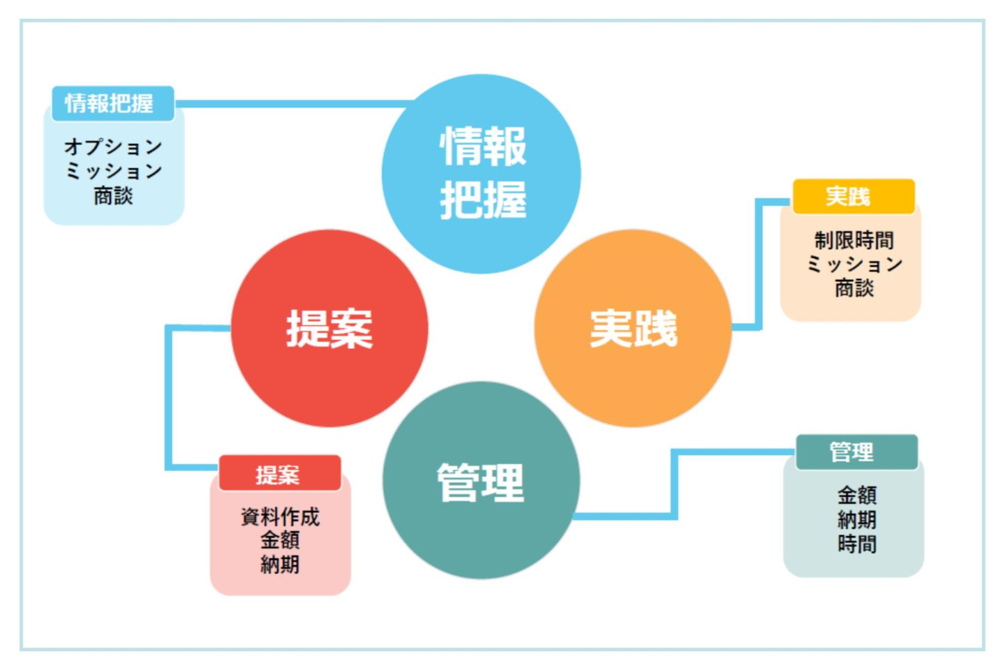 たとえば、雑貨店のオンライン販売アプリを改良するという設定で、営業担当はクライアントの要望をヒアリング。技術担当はその要望をもとに、システム開発を行います。