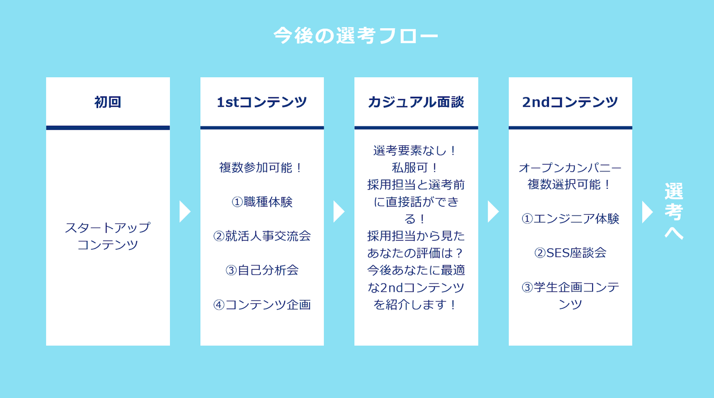 インターンシップは、【スタートアップコンテンツ→1stコンテンツ→カジュアル面談→2ndコンテンツ】という流れで参加していただけます。