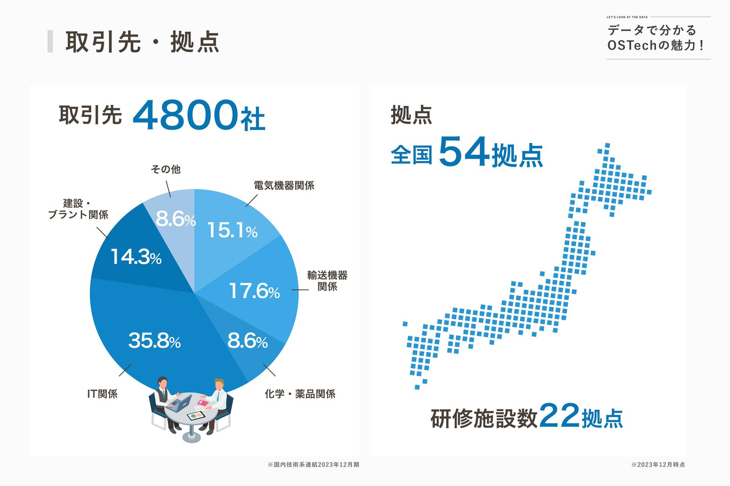 OSTechは全国に拠点を展開し、数千社の企業様との取引実績があります。業界に根ざしたネットワークと確かな技術力を強みに、幅広い分野で信頼されるパートナーとして選ばれています!
