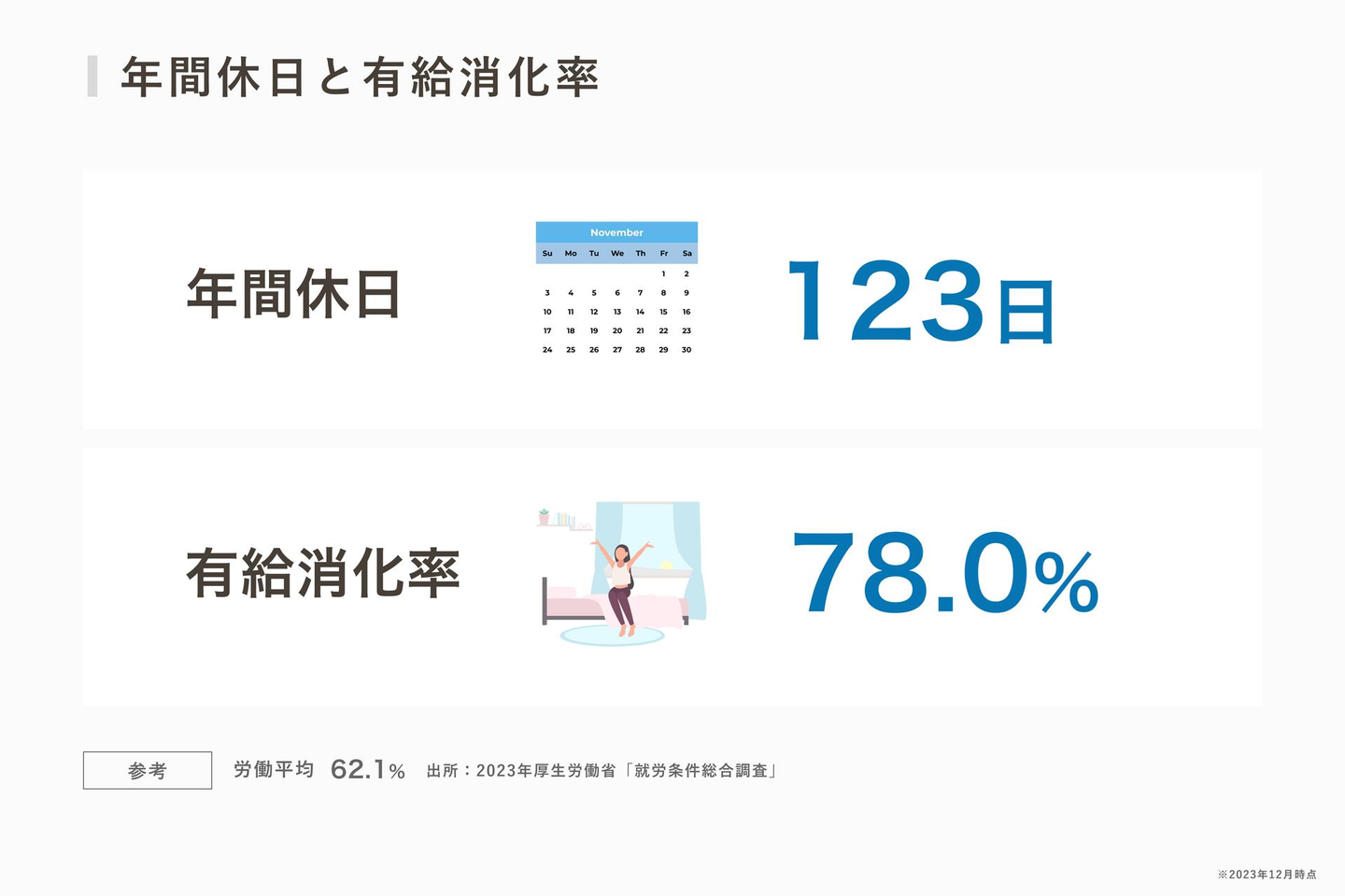 社員一人ひとりの生き方を大切にし、充実したワークライフバランスを実現しています。「年間休日がしっかり確保されている」「有給休暇の取得率が高い」など働きやすい環境で、キャリアを築けるのが特徴です。