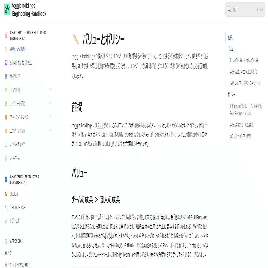 久森:トグルのことをしっかりと理解してもらうために、まずドキュメント(toggle holdings Engineering Handbook)(以下、ハンドブック)の整備を行いました。