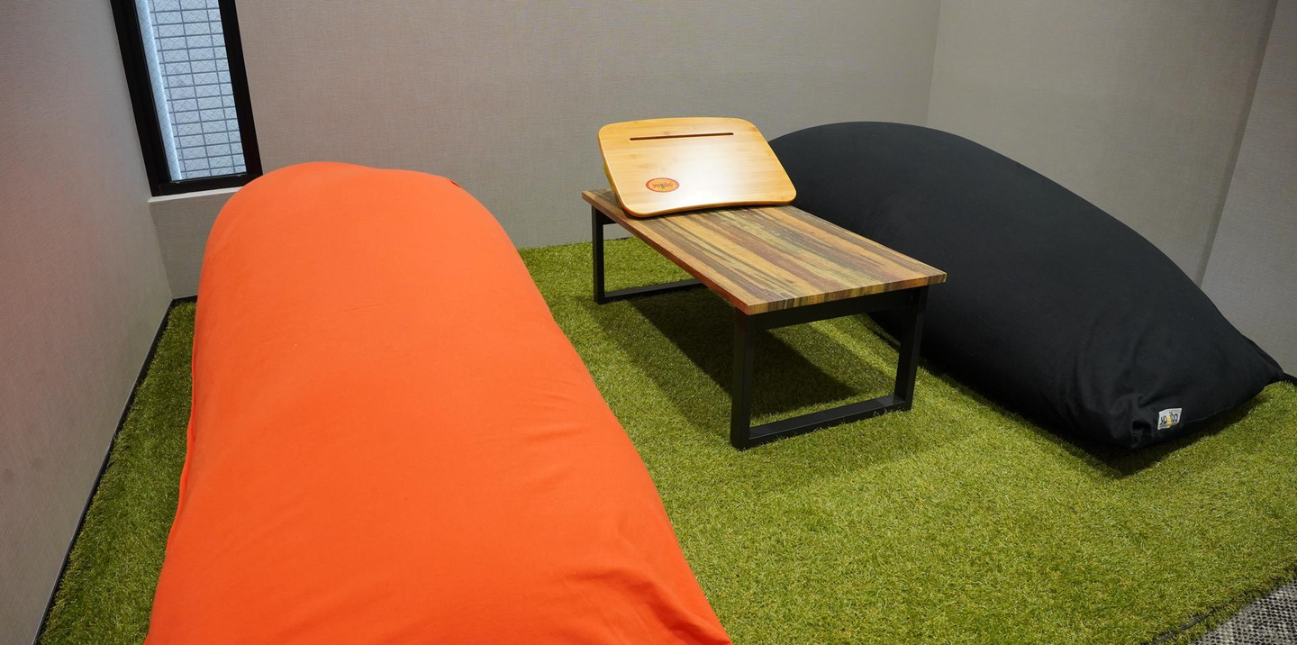 クッションの存在感が大きいこの癒し空間は、ゆったりしながら仕事ができるリラックスルームです。芝生に置かれた大きなヨギボに身を委ねながら仕事や休憩ができるスペースになっています!