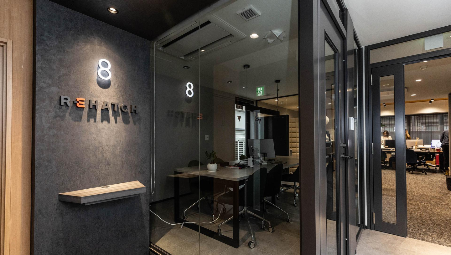 エレベーターで8階のフロアまで上がると、REHATCHのかっこいいロゴがお出迎えしてくれます!!(ロゴに込めた熱い想いはこちらに掲載しています。ご興味ある方はぜひご覧ください。)