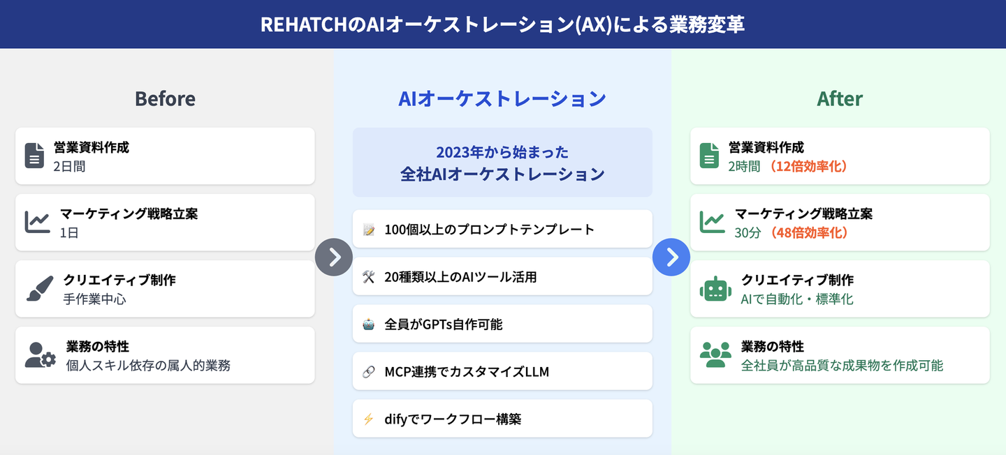 合わせて、弊社REHATCHで行っているマーケ×AIオーケストレーション(AX)の取り組みもまとめたいと思います。AI時代のマーケティングに携わる人にはぜひ見てほしいです。