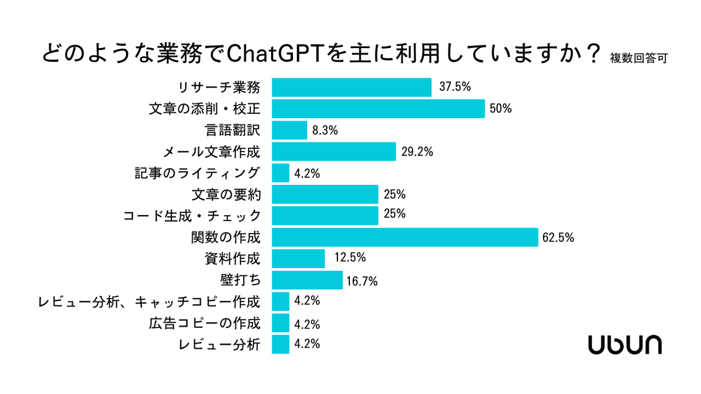 具体的には、関数の作成(62.5%)、文章の添削・校正(50%)がよく使われることがわかりました。