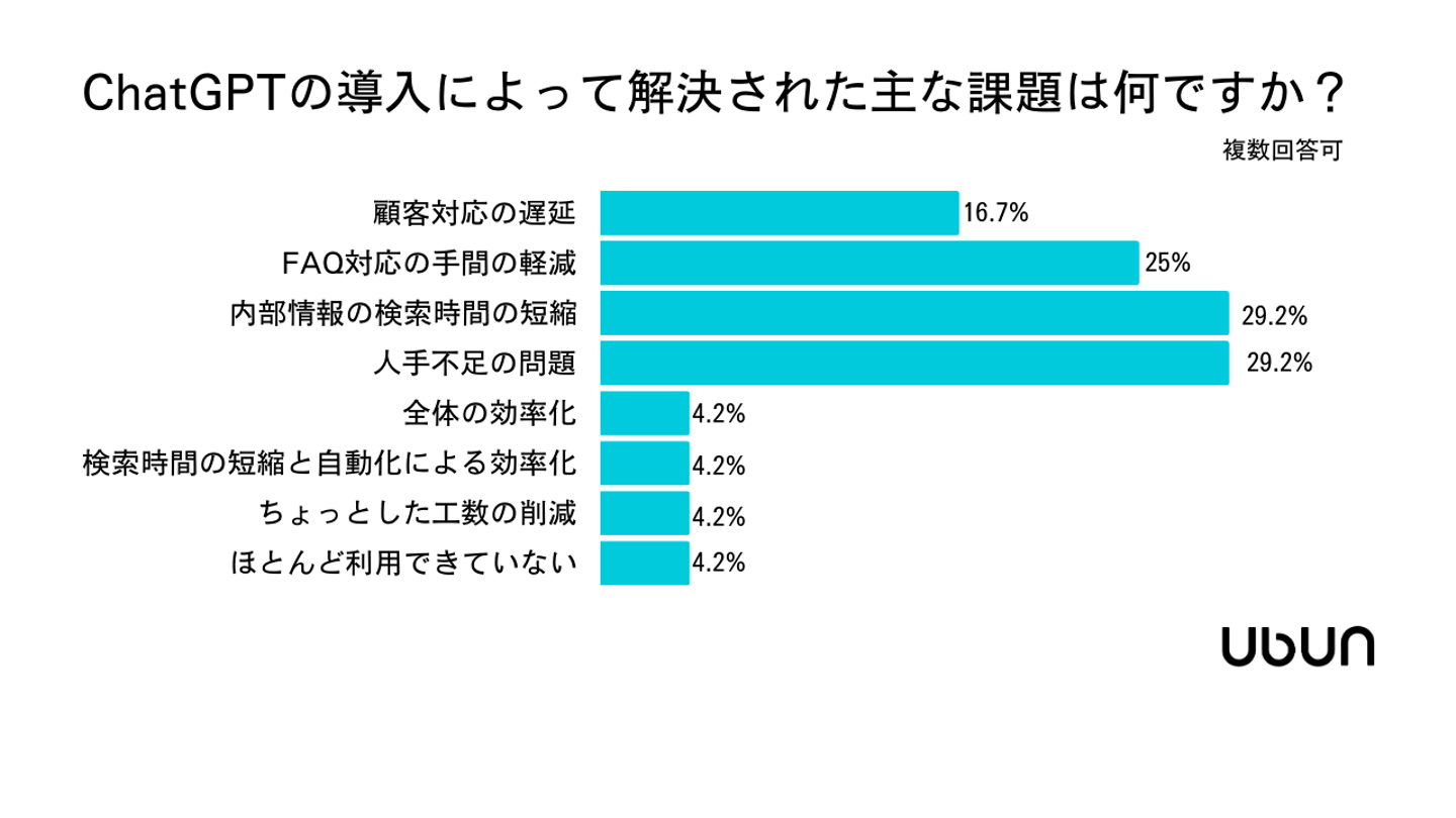 「内部情報の検索時間の短縮」「人手不足の問題」に繋がったという回答が同率で最も多い結果となりました(29.2%)。社内での業務だけでなく、顧客対応のスピードUPにも繋がったという回答も見られました。