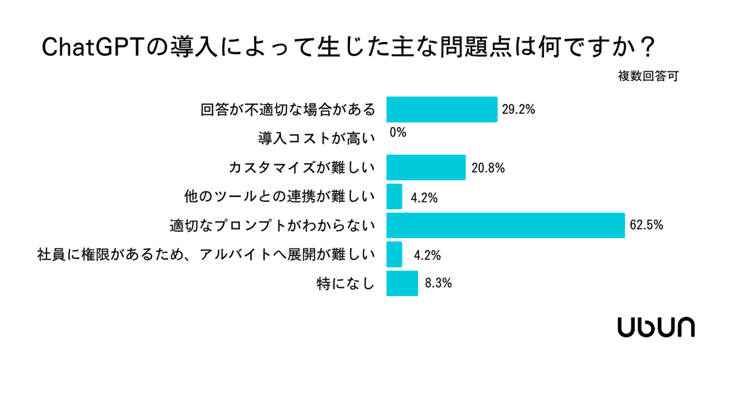 導入後、実際に使ってみてウブン社員が感じている課題としては「適切なプロンプトがわからない」という回答が非常に多いことがわかりました。