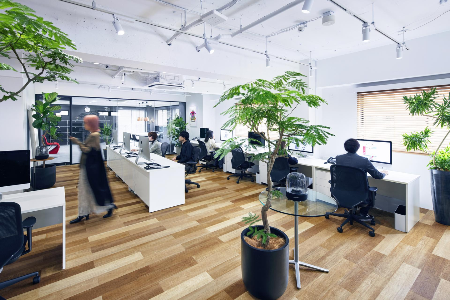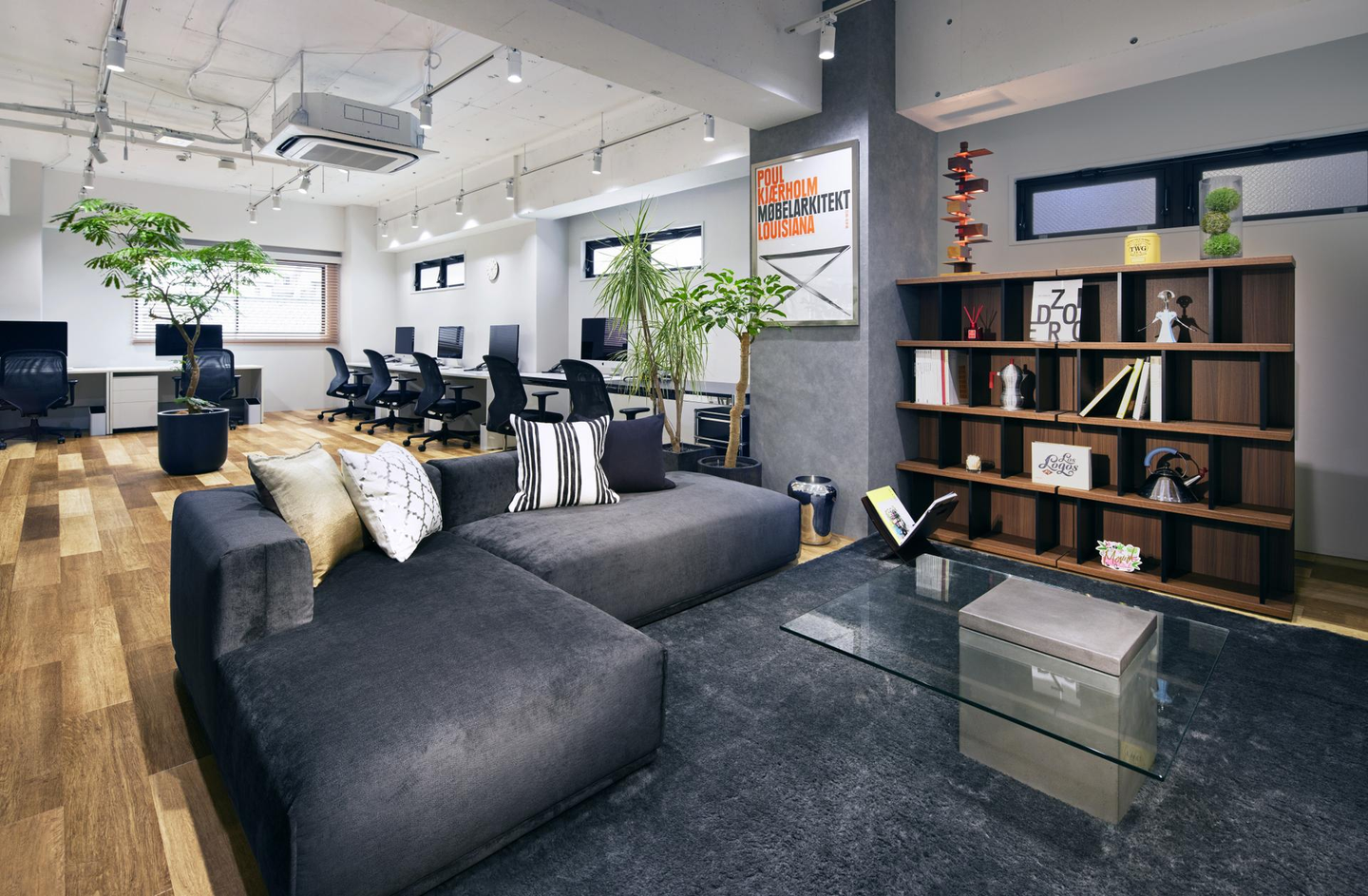 レセプションルームとワークスペースは大きなガラスウィンドウで仕切り、日光を取り入れ開放的に。ワークスペースのレイアウトやツールも快適に制作業務に取り組めるよう設計しています。