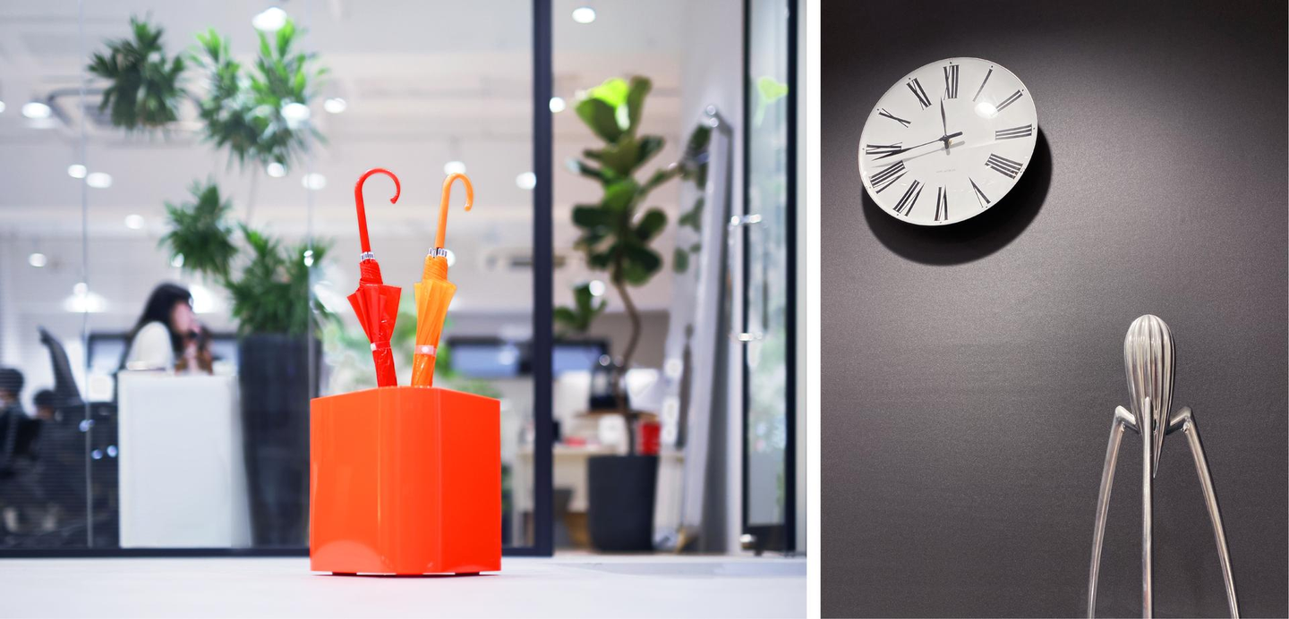 小物はイタリアを代表するハウスウェアメーカーであるALESSIのものが多く、ロケットのようなレモンスクイーザーや、可愛らしいワインオープナー、巨大な傘立てなどユーモアに富んだアイテムも多く空間のアクセントにしています。
