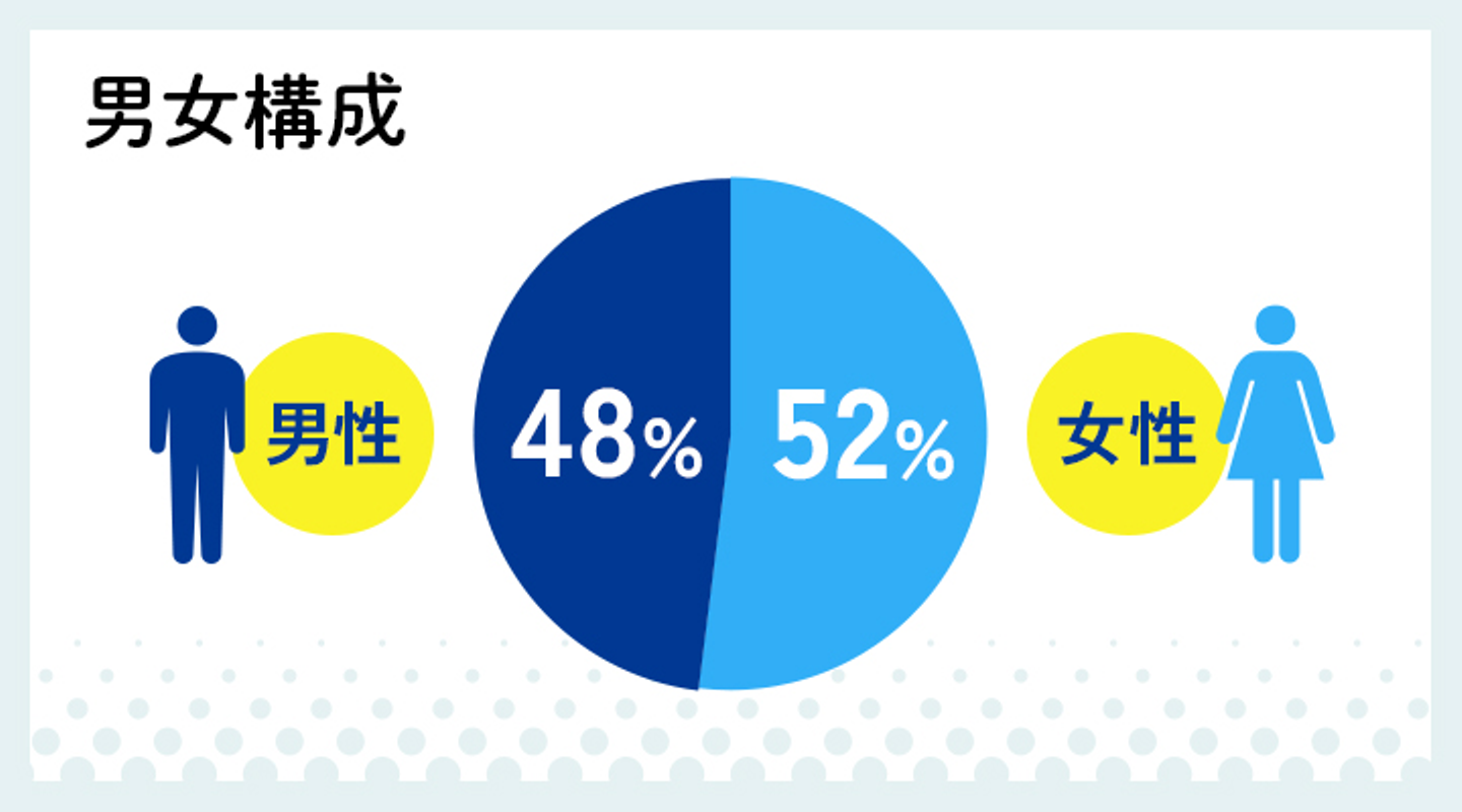 まず当社の男女比ですが、ほとんど半々の割合です。