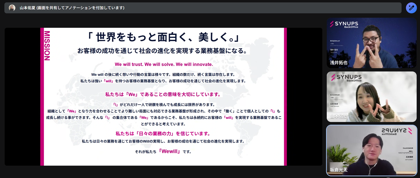 山本:Wewillのオンボーディングは、誰かに教わるというより、「自分の言葉で語る」ことを中心にしています。受け取った情報をどう解釈し、どう行動につなげるかを言語化する。いわば“思考を整理する場”として機能しているんです。