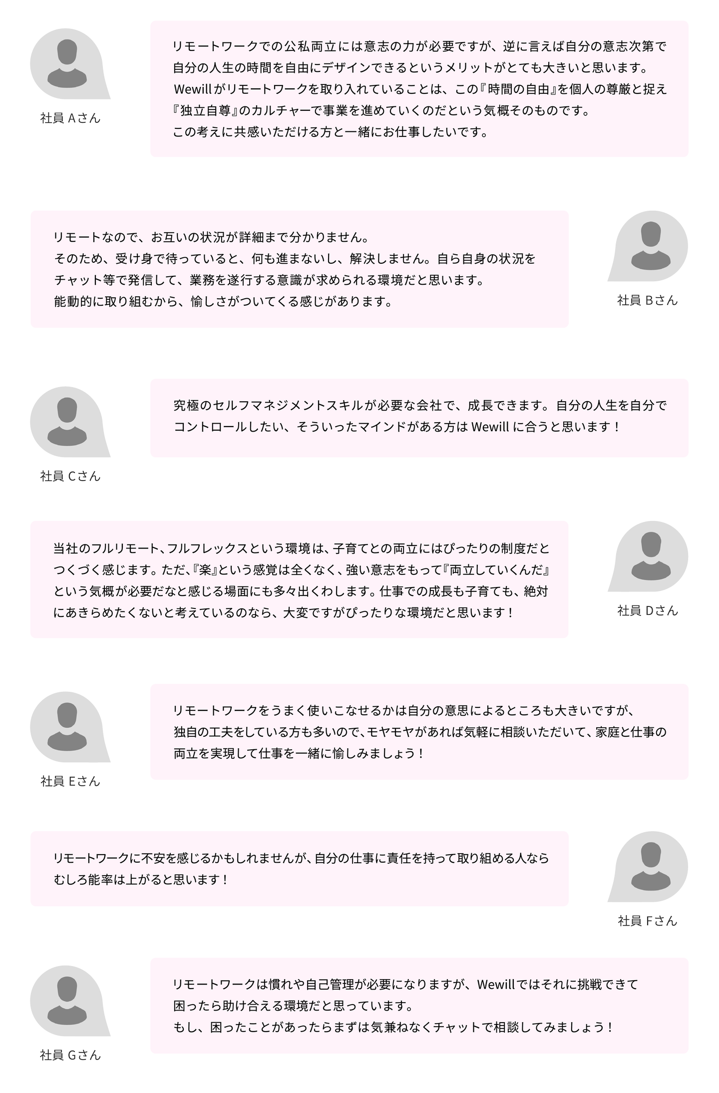 Wewillでは、「独立自尊」を大切な価値観とし、フルリモート&フルフレックスという自由度の高い環境のなかで、社員一人ひとりが自律的に働いています。そのなかで生まれたカルチャーに共感してくださる方には、きっとのびのびと働ける場所になるはずです!