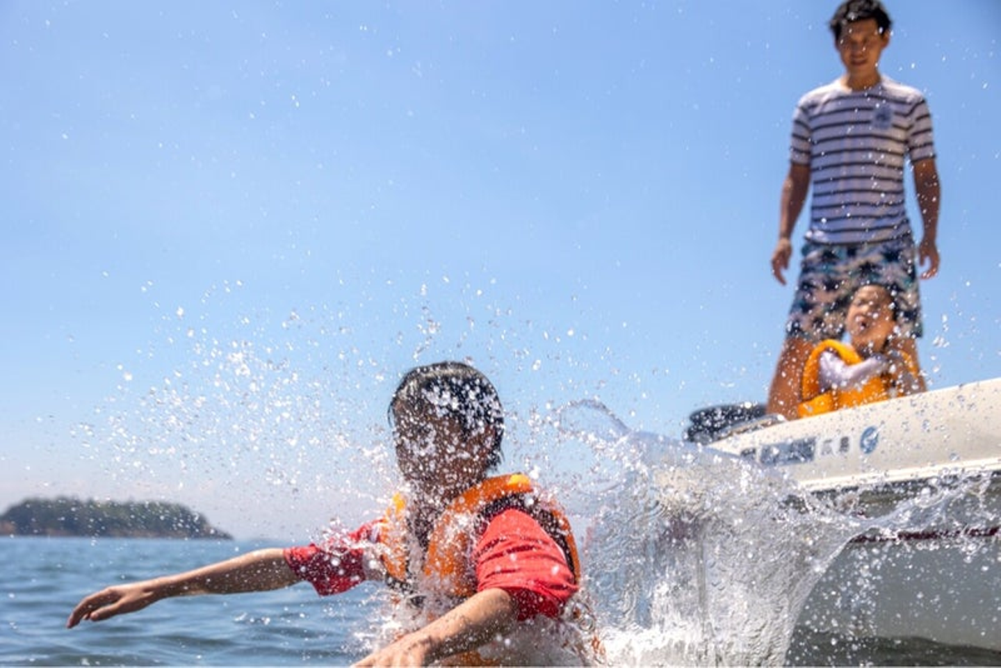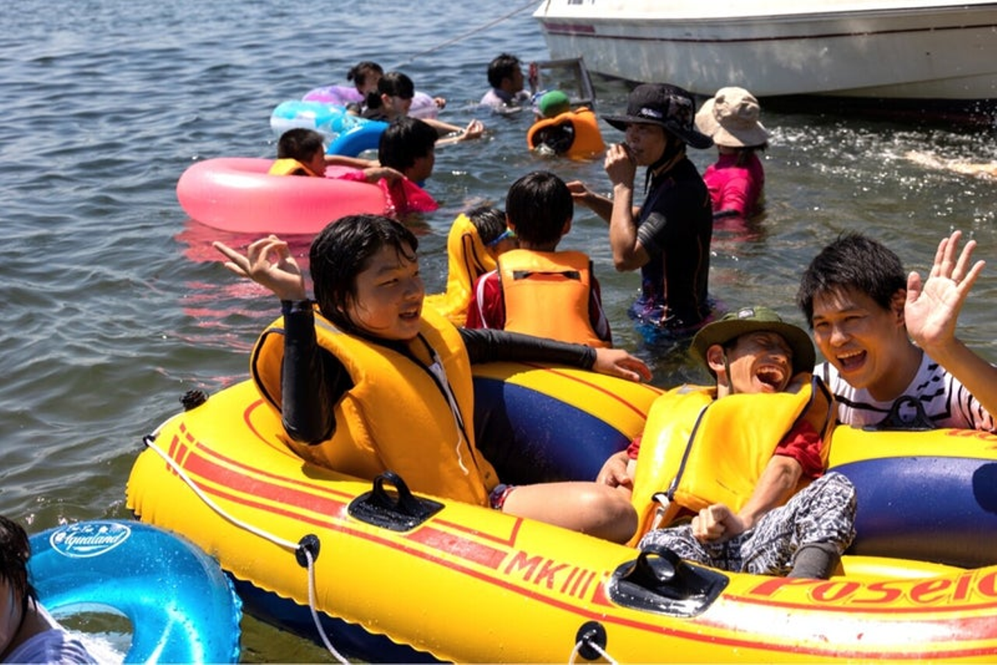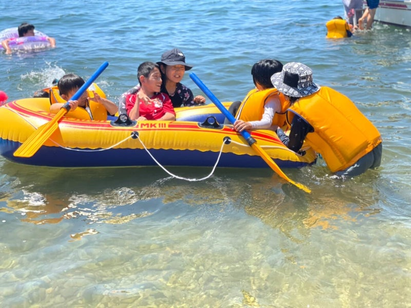 海遊びでは、一緒にゴムボートに乗ったりボートからの飛び込みにも挑戦したりしています。