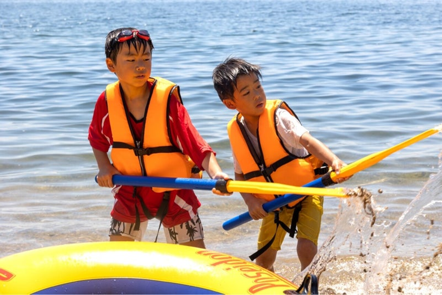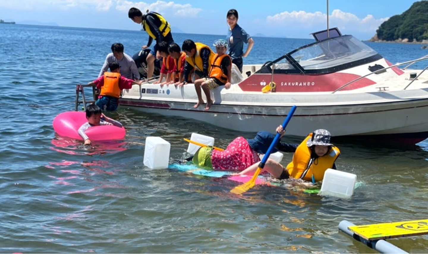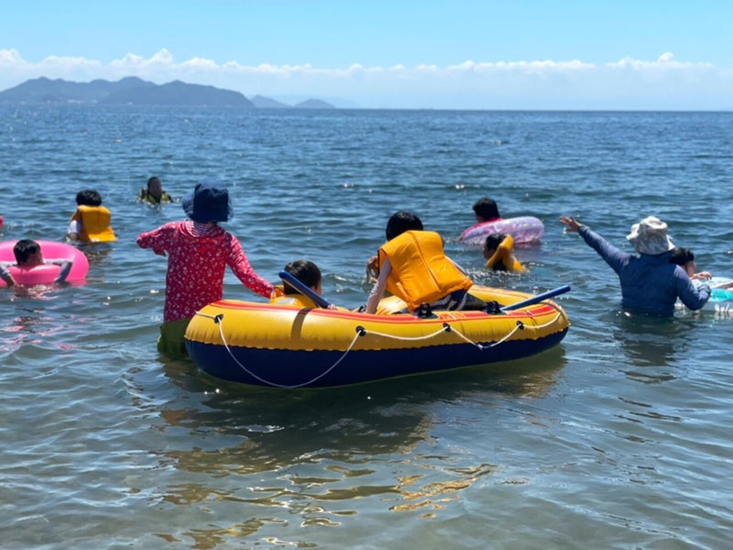 海遊びでは、一緒にゴムボートに乗ったりボートからの飛び込みにも挑戦したりしています。