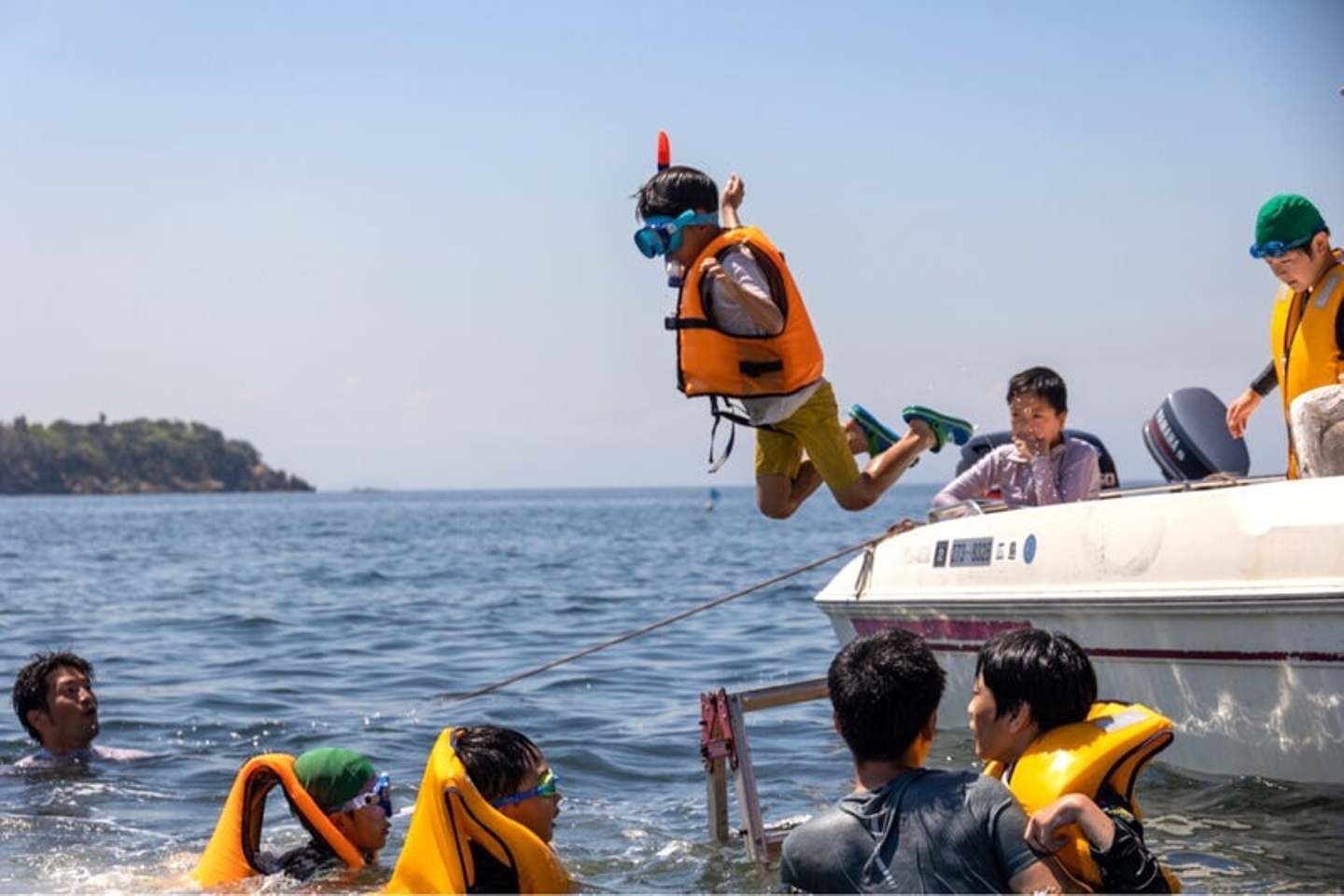 ボートは子ども達が海に到着する前に海岸近くへ移動させロープで固定。海遊びの中で、子ども達はボートから飛び込みの練習をします。
