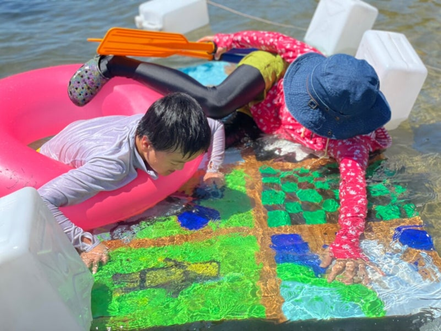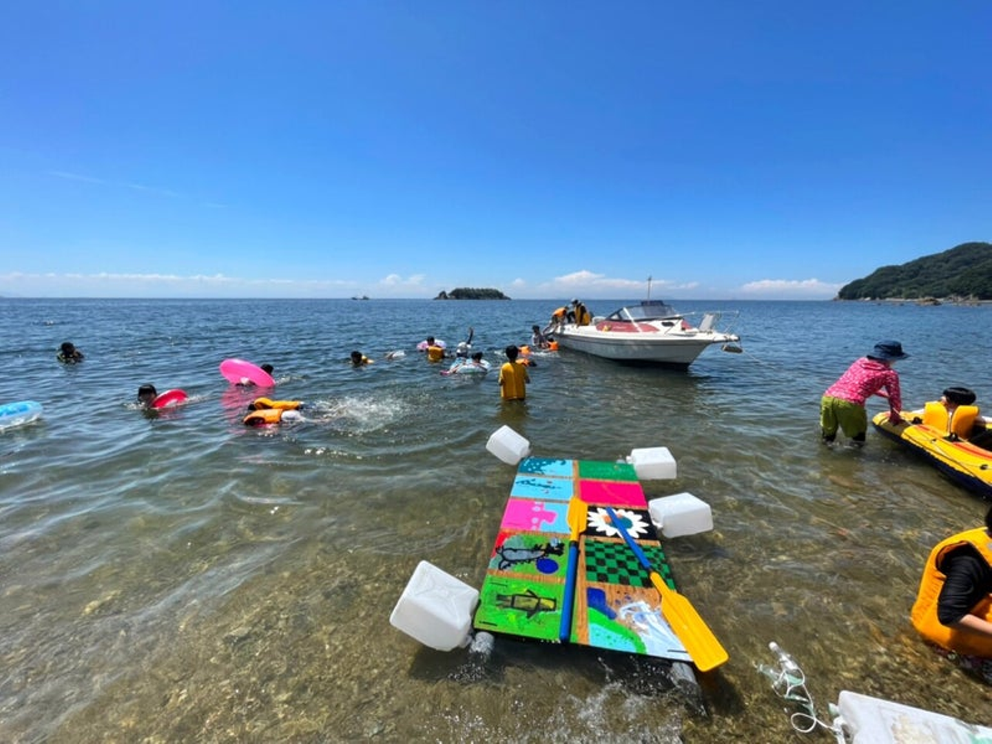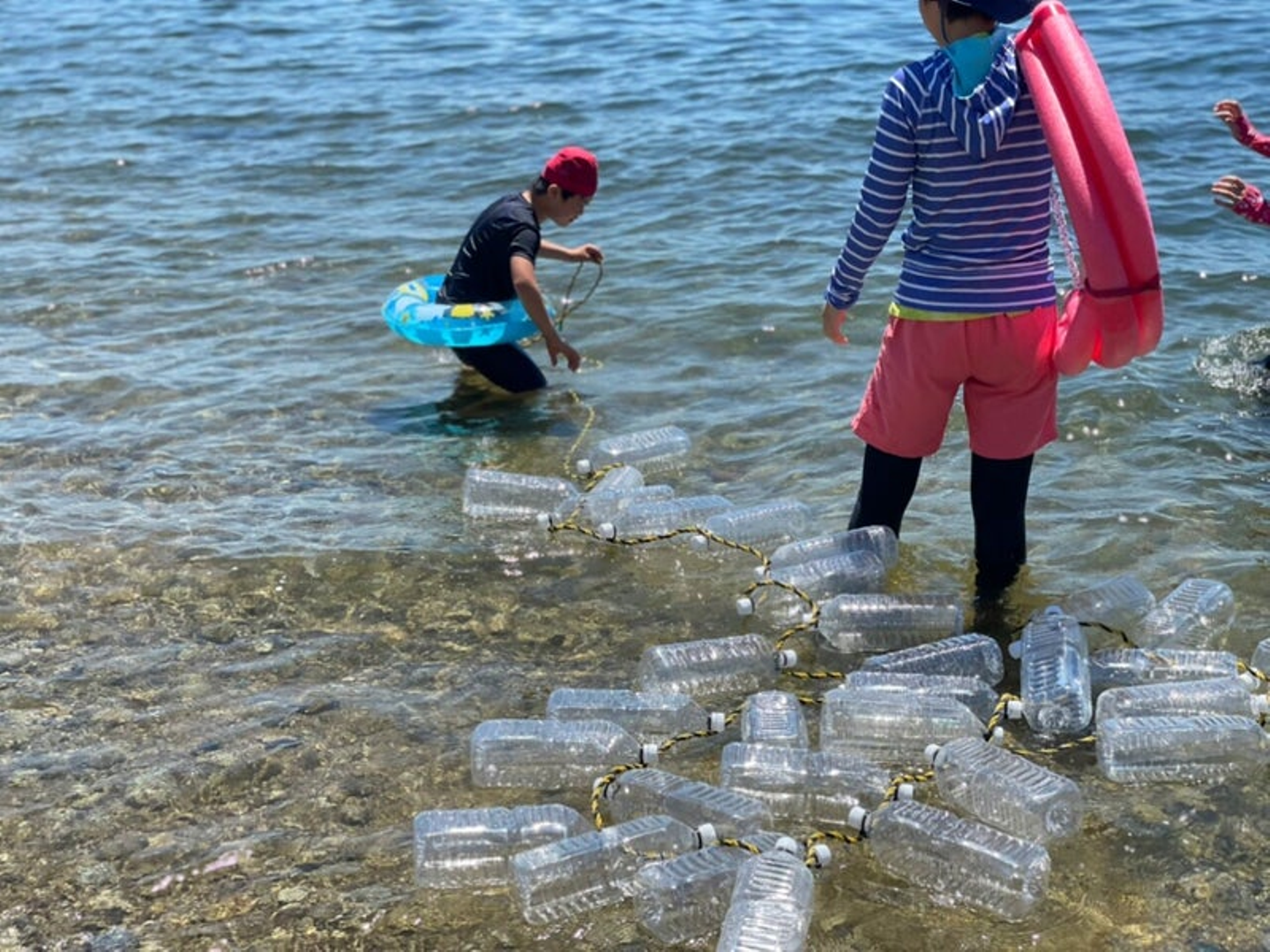 ベニヤ板を繋ぎ合わせたイカダ、ペットボトルを繋いだ浮きなど、自家製の遊具も海遊びでは大活躍です!