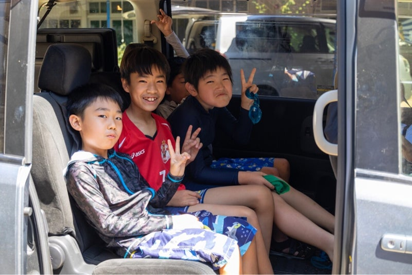 さくらんぼでは、毎年夏になると天候の良い日はほとんど海に出かけます。海遊びの場所は車で約2分、徒歩で約10分の所にあります。たくさんの遊び道具を持参し車に乗り込む子ども達は、いつも笑顔でいっぱいです。