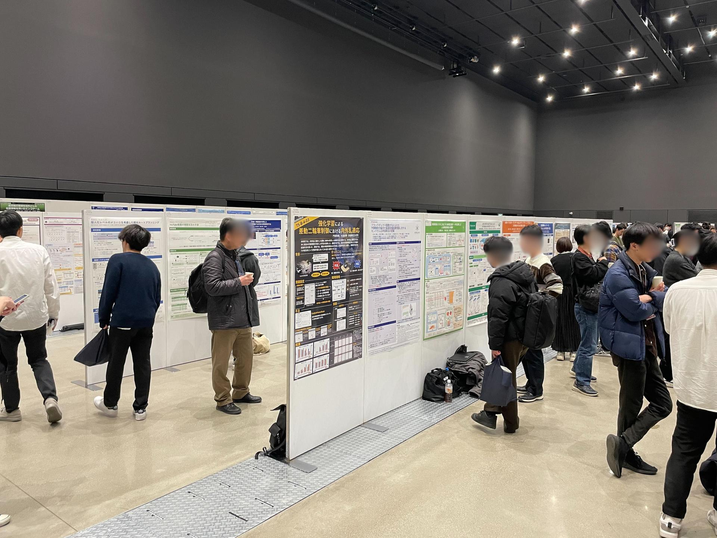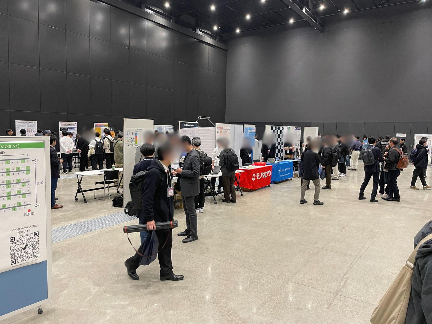 同じフロアには、所狭しと学生等による研究発表が掲示されていました。研究は AI に関するものをはじめ、データベース技術に関するもの、統計的手法に関するものなど、レベルの高い内容が並びました。特に生成 AI への関心は高く、学生研究でありながら、本格的な生成 AI アプリケーションの開発を行っている研究もありました。正確に数えたわけではありませんが、100を超える研究結果が掲示されており、掲示物の前で研究内容を解説する学生もいました。