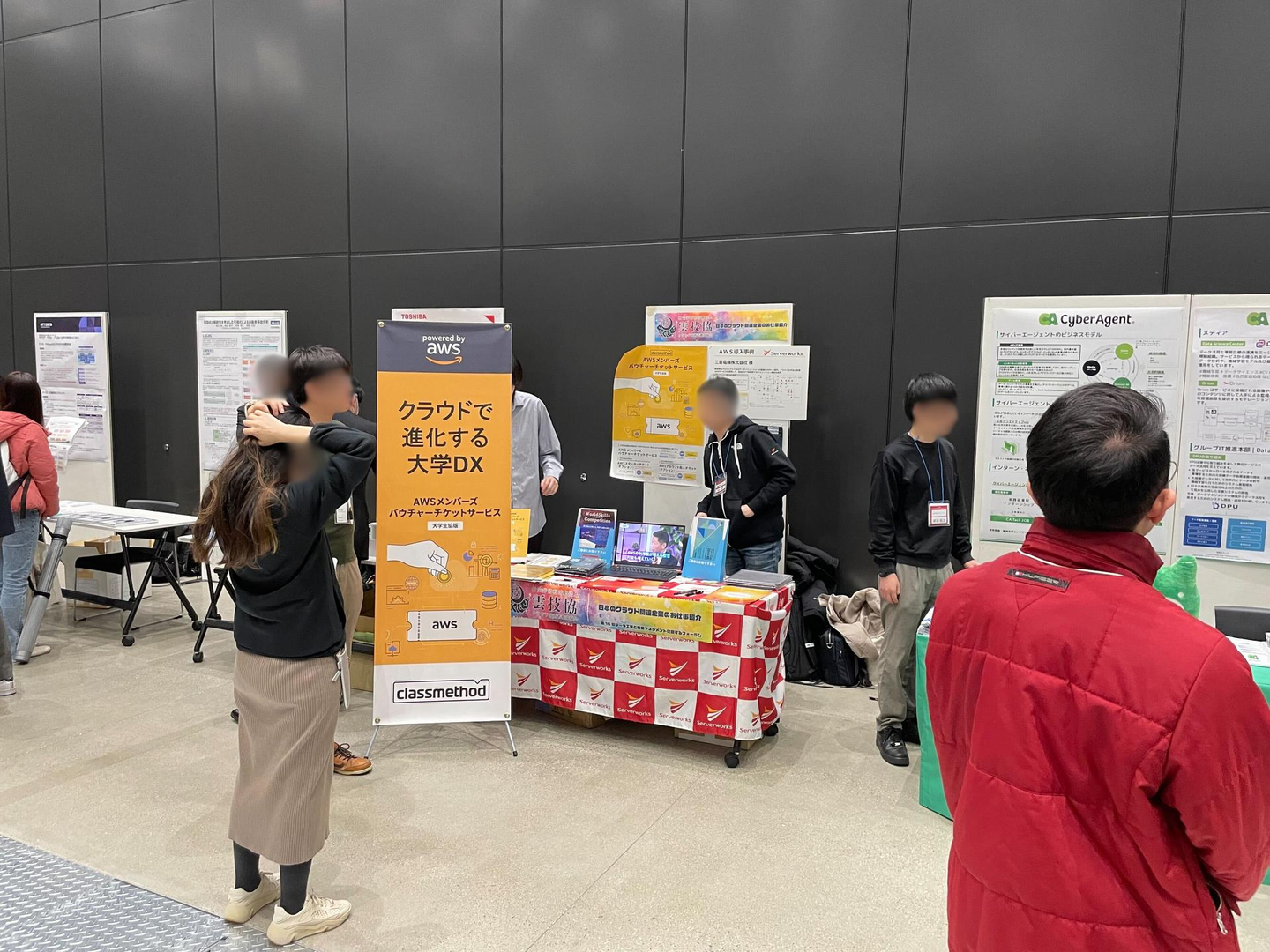 スポンサーブースエリアには、クラウド技術者養成協会様、クラスメソッド様、サーバーワークス、G-gen の合同ブースを設置しました。クラウド技術に興味のある学生や大学教員を対象に、情報提供などを行いました。学生や教員からのクラウドへの関心は高く、多くの来場者が私たちのブースを訪問しました。