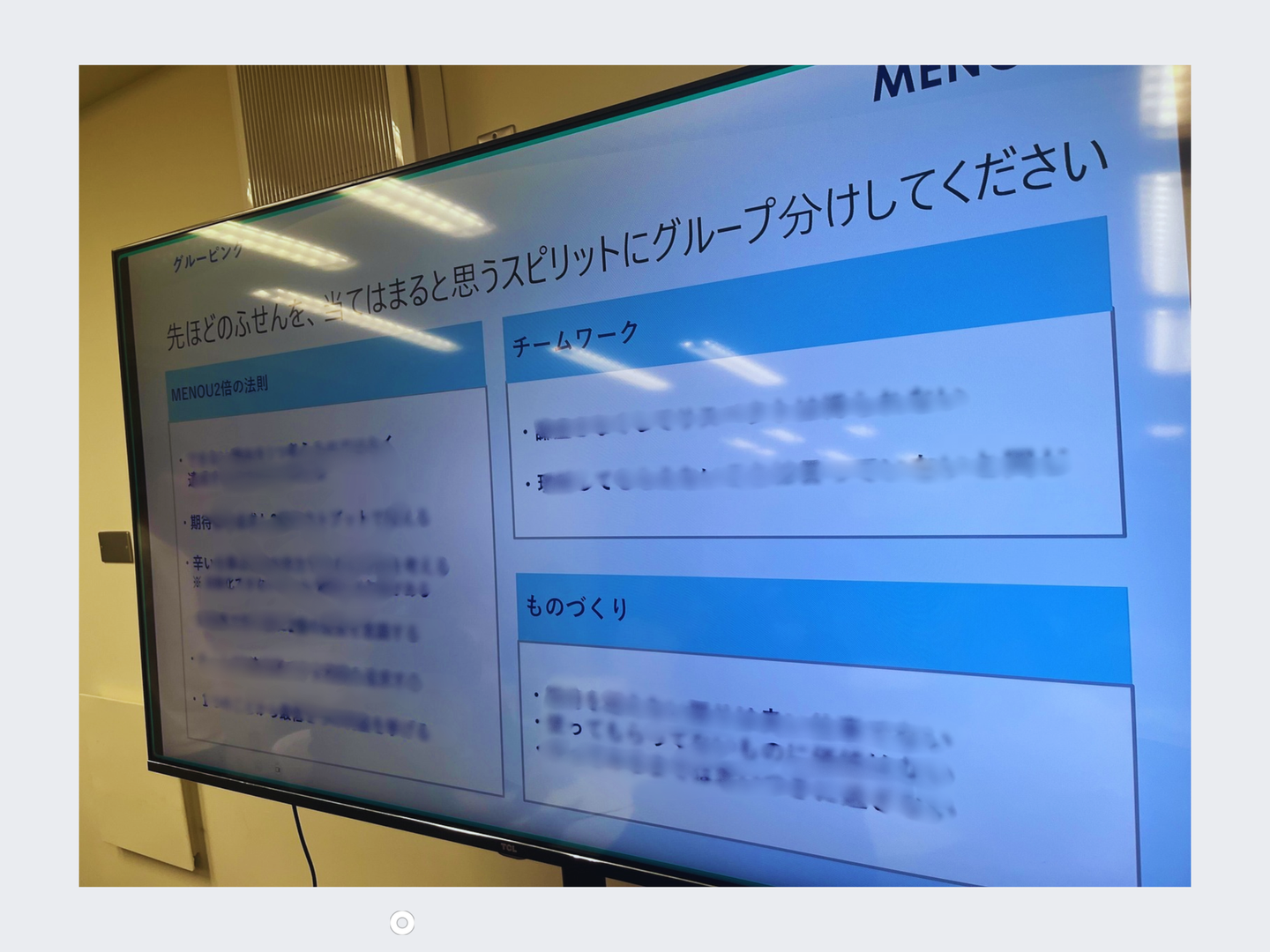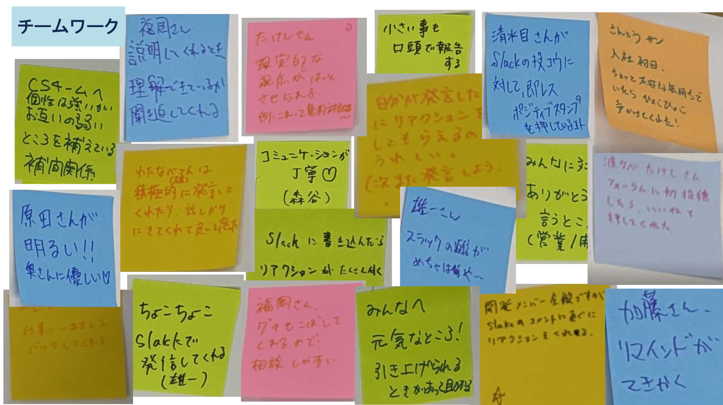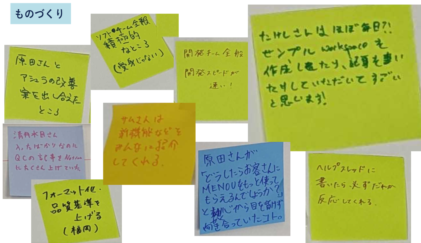 全社ミーティングの最後は、グループワークを行いました。「MENOUで働く中で、"いいね!"と思ったメンバーのアクションや発言、考え方をふせんに書く」⇒ その後、「書いたふせんを、どのスピリットを体現しているかに分類する」というものです。MENOUでもこんな、いわゆる会社らしいワークショップをやるんだなぁ、と意外に思ったのは私だけでしょうか。