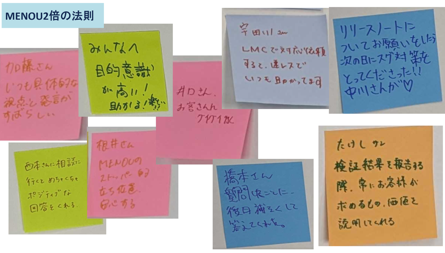 それは、MENOU2倍の法則、チームワーク、ものづくりです。